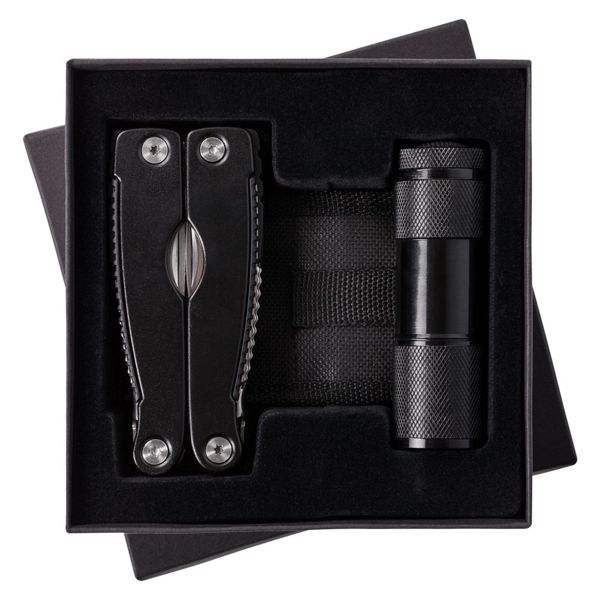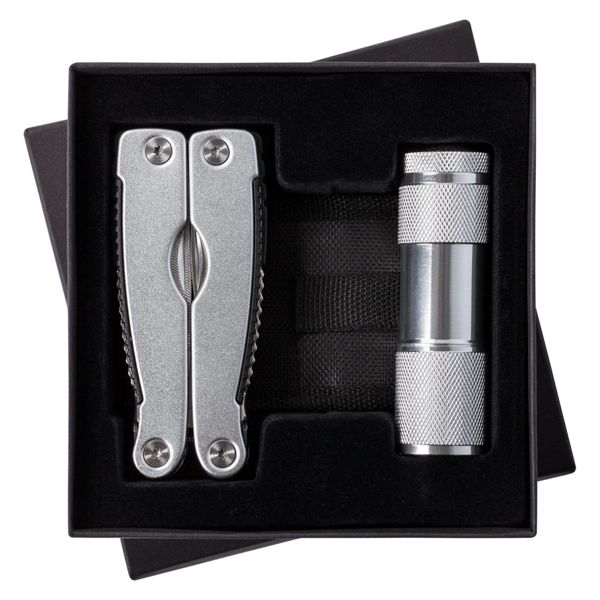 фонарик - алюминий; мультитул: инструменты - нержавеющая сталь; рукоятки - алюминий; чехол - полиэстер; коробка - картон