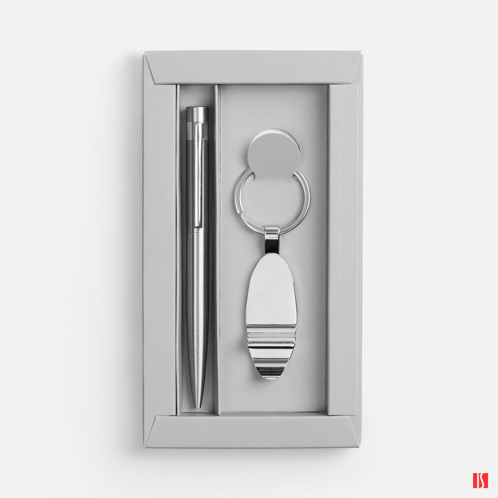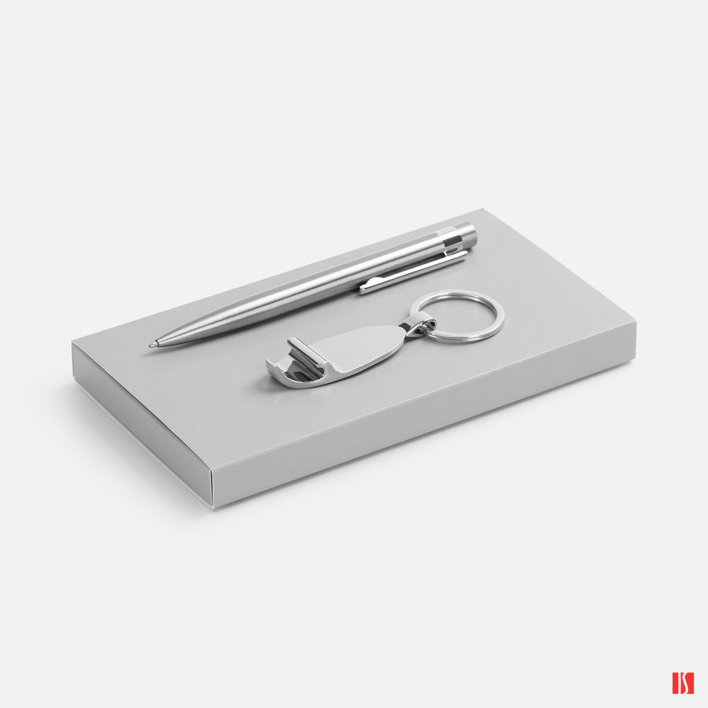 Этот комплект сочетает в себе практичность и элегантность, внимание к деталям и заботу о партнере или коллеге. Ручка с плавным письмом станет надежным спутником в рабочих буднях, а брелок-открывашка — полезным аксессуаром выходного дня. Заказать с нанесением логотипа от компании «Синтезис».