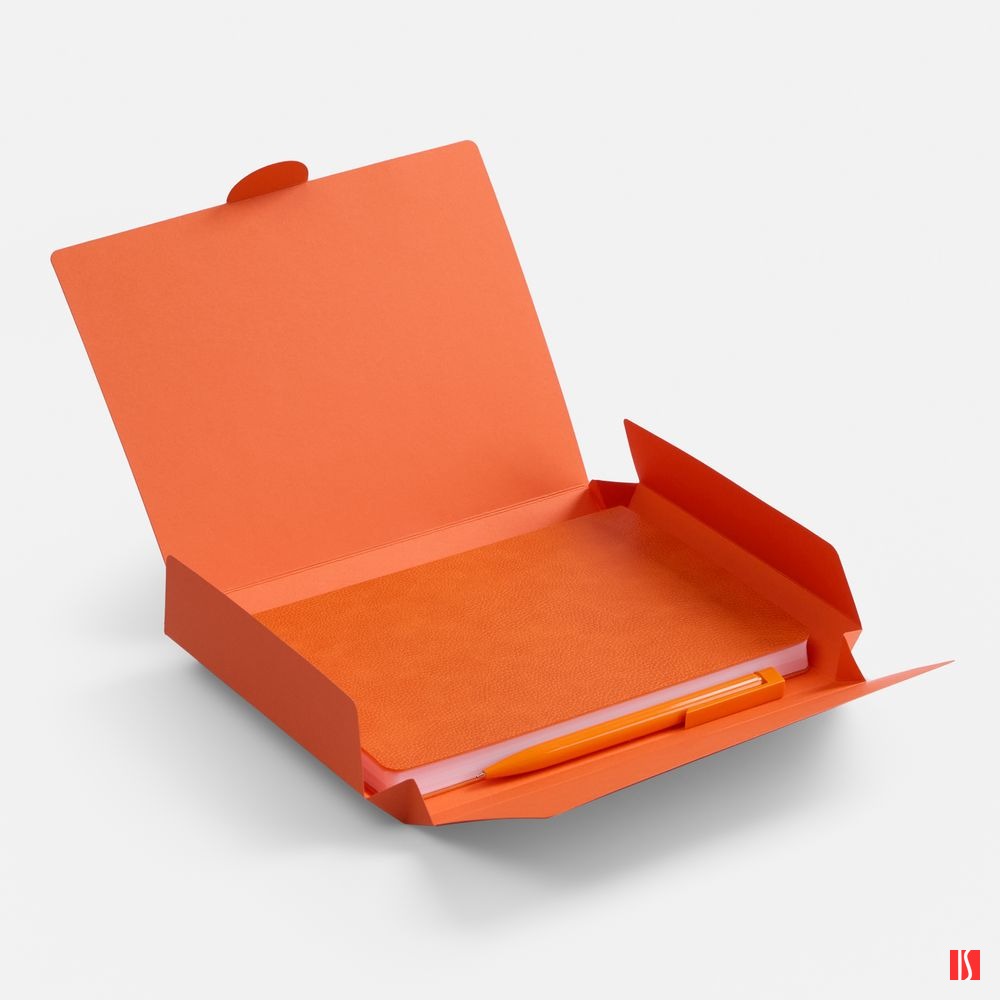 Недатированный ежедневник с гибкой обложкой из фактурного материала La Fite и металлическим шильдом на ляссе и ручка в тон, упакованные в подарочную коробку из дизайнерского картона. Заказать с нанесением логотипа от компании «Синтезис».