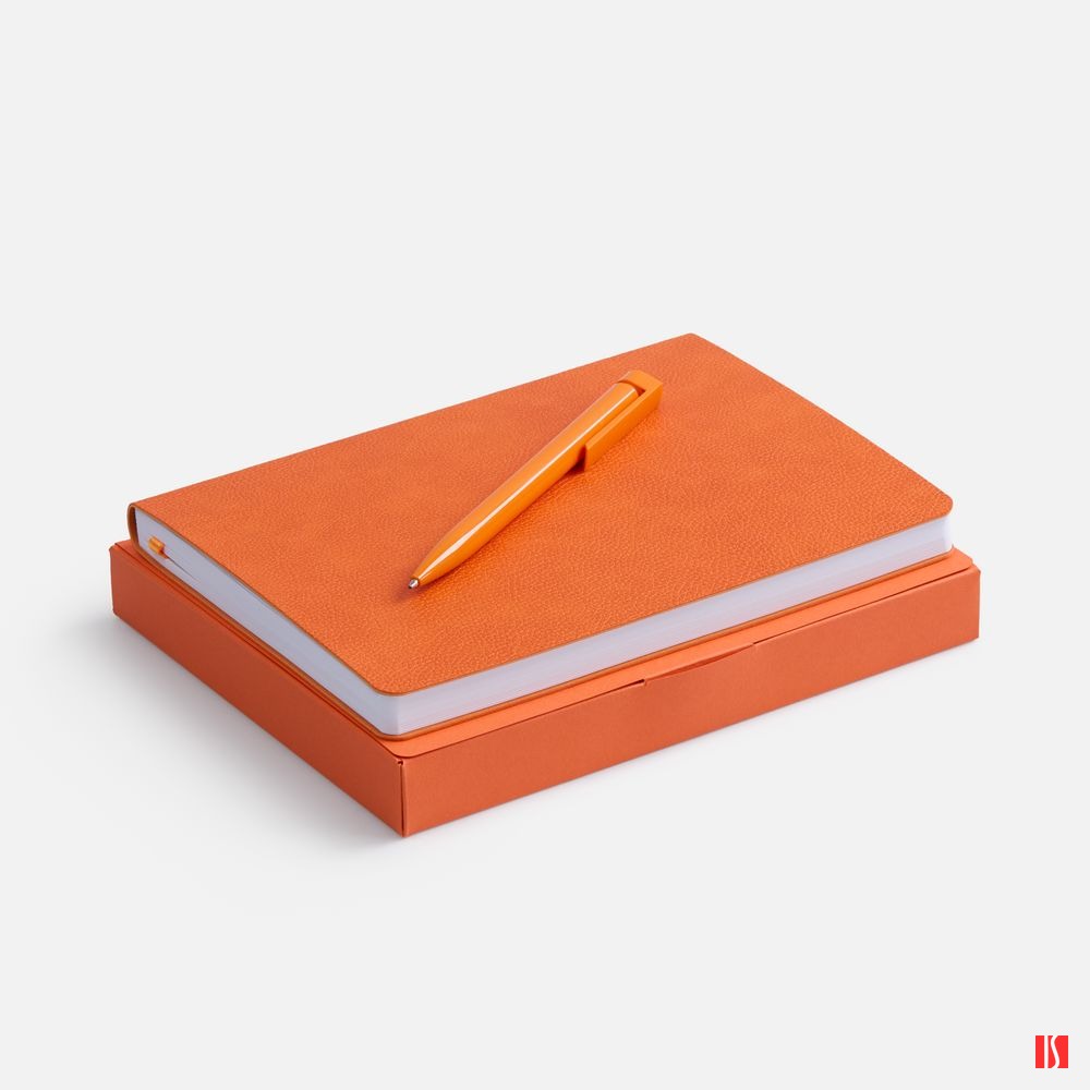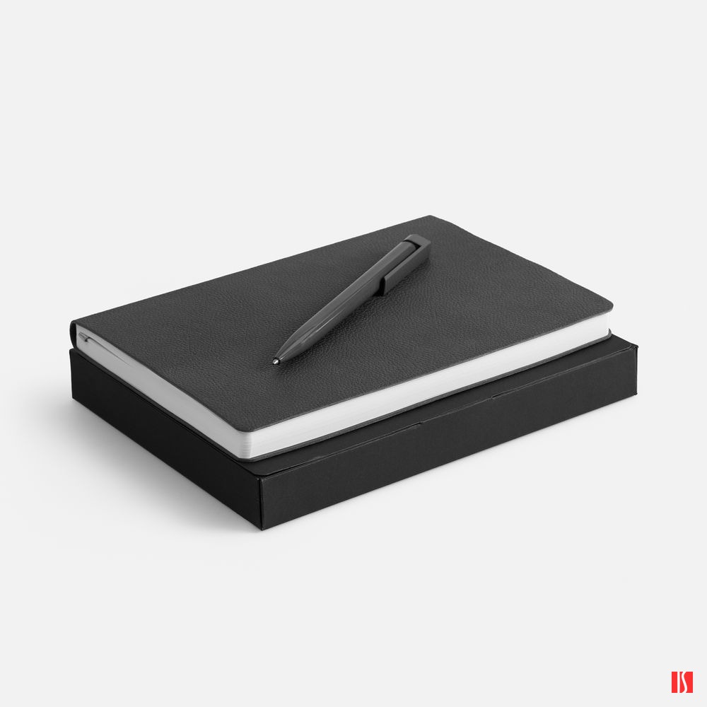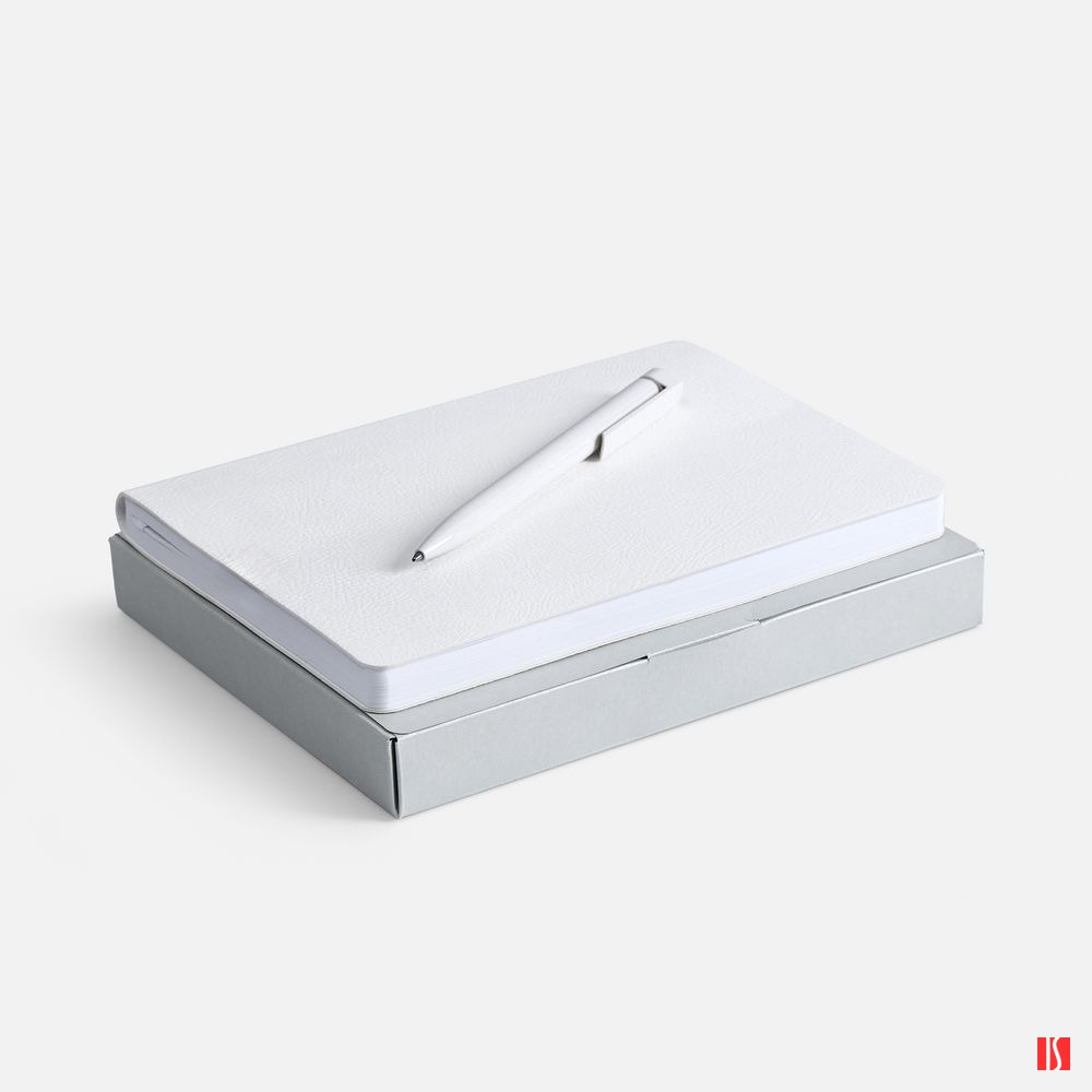 Недатированный ежедневник с гибкой обложкой из фактурного материала La Fite и металлическим шильдом на ляссе и ручка в тон, упакованные в подарочную коробку из дизайнерского картона. Заказать с нанесением логотипа от компании «Синтезис».