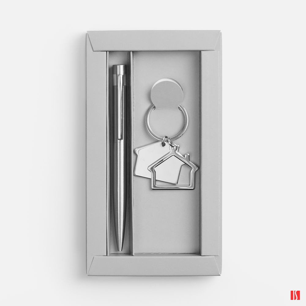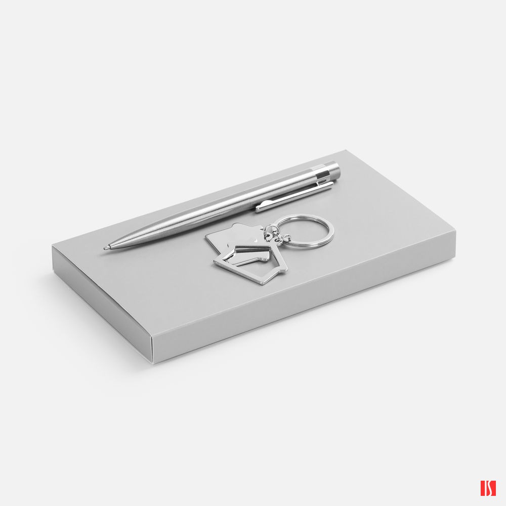 Шариковая ручка в матовом корпусе из переработанной стали не только подчеркивает заботу об экологии, но и дарит уверенность в каждом слове. Металлический брелок с подвесками в форме домика — идеальный промосувенир для строительных компаний, агентств недвижимости и ремонтных сервисов.