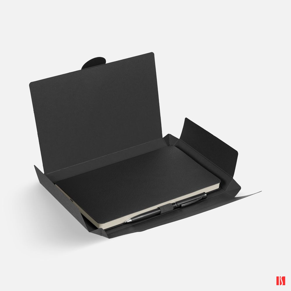 Зауженный ежедневник и ручка комплементарного оттенка в простой лаконичной коробке — готовое предложение делового подарка для сотрудников и партнеров. Заказать с нанесением логотипа от компании «Синтезис».