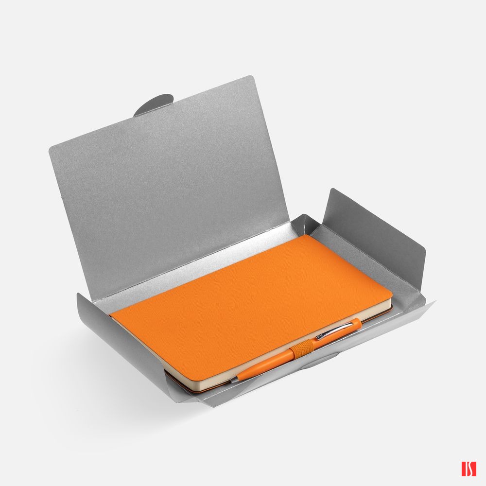 Зауженный ежедневник и ручка комплементарного оттенка в простой лаконичной коробке — готовое предложение делового подарка для сотрудников и партнеров. Заказать с нанесением логотипа от компании «Синтезис».