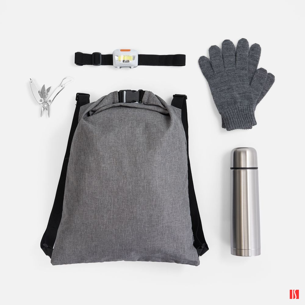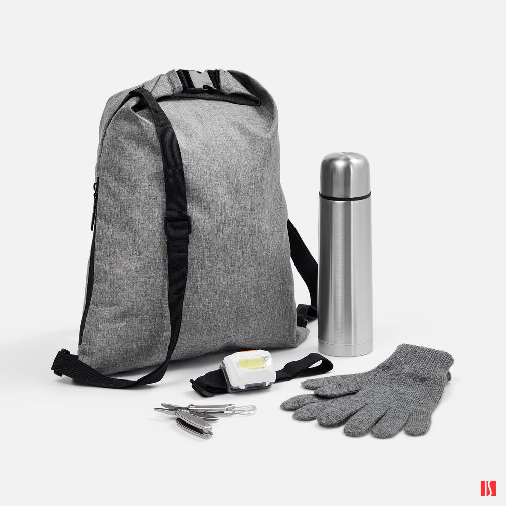 перчатки - 50% шерсть, 50% акрил; фонарь - пластик; мультитул - нержавеющая сталь, алюминий; термос - нержавеющая сталь, 304 внутри, 201 снаружи; пластик; рюкзак - полиэстер, 300D