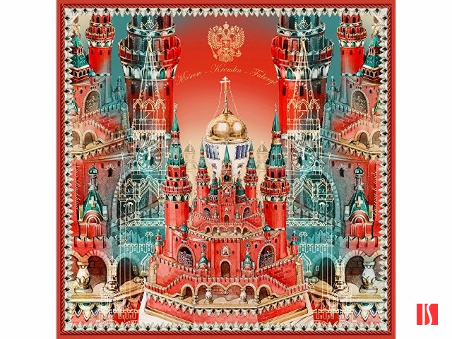 Платок «Кремль – Москва» в шелке воплощает шедевр ювелирного искусства Карла Фаберже из серии подарков для русской императорской семьи. В центре полотна расположен Успенский собор в обрамлении башен Московского Кремля. Утонченный рисунок, яркое цветовое решение и глубокий символизм дизайна платка созданы для эффектного акцента праздничного образа.