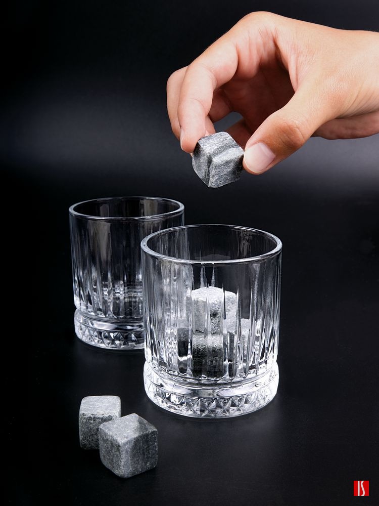 Набор Rock and Cold — стильный подарок для ценителей виски: два рельефных стакана с толстым дном и охлаждающие камни для идеальной подачи любимого крепкого напитка.