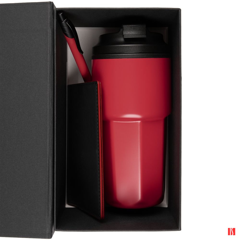 термостакан - нержавеющая сталь, полипропилен; обложка для паспорта - искусственная кожа; ручка - металл, пластик; коробка - переплетный картон