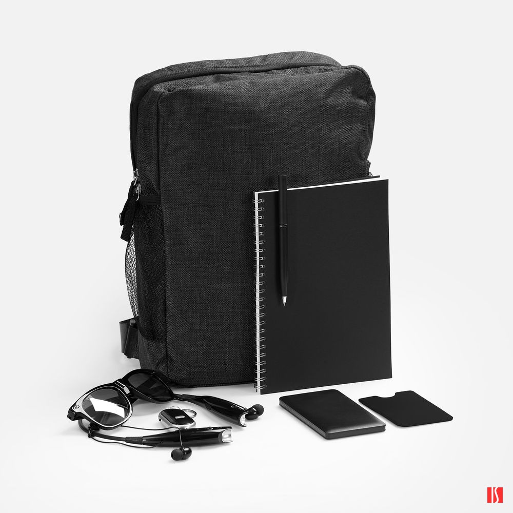 рюкзак - полиэстер, 600D; наушники, аккумулятор, брелок - пластик; очки - пластик, поликарбонат; ручка - металл, пластик; блокнот - бумага, картон; чехол - искусственная кожа; покрытие софт-тач