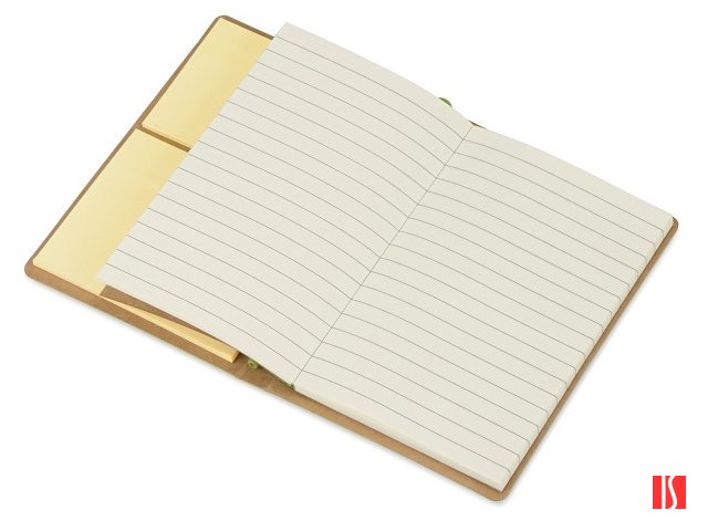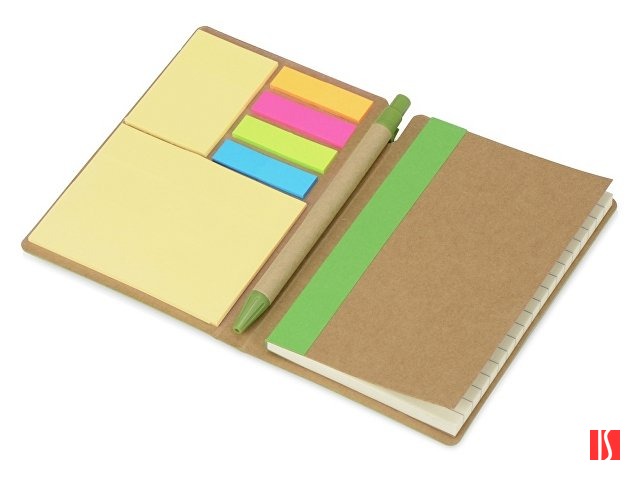 Компактный набор включает в себя разноцветные стикеры разных размеров, блокнот с линованной бумагой и ручку c корпусом из переработанного картона. Обложка выполнена из фактурной искусственной кожи, которая, при тиснении, меняет цвет на более глубокий. Заказать с нанесением логотипа от компании «Синтезис».