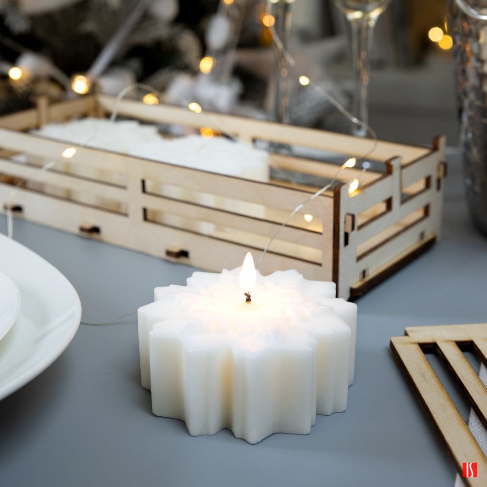 Набор из трех свечей в фанерном ящичке. Каждая снежинка в наборе представлена в своем неповторимом узоре.Набор из 3 свечей в ящике. Каждая снежинка упакована в отдельный полиэтиленовый пакет.