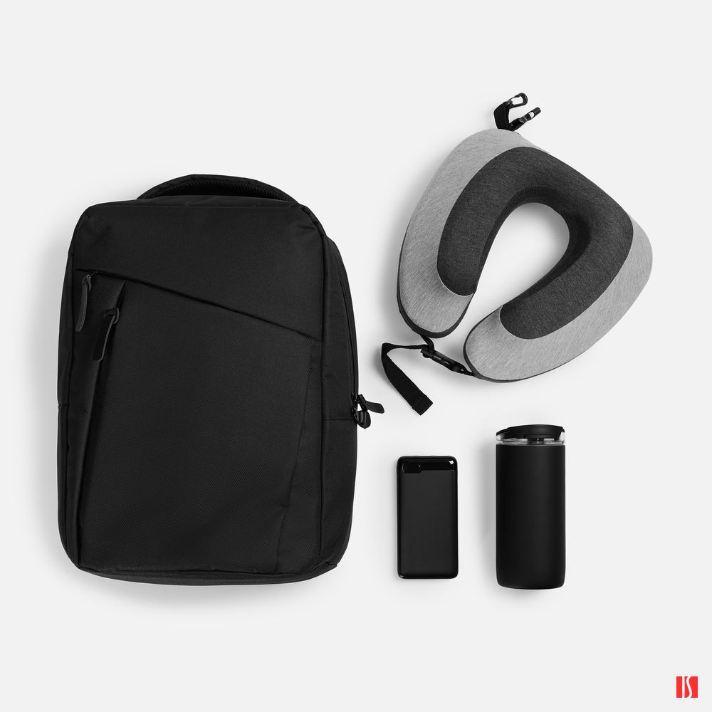 Этот стильный комплект включает в себя все необходимое для комфортных путешествий: практичный рюкзак, мощный внешний аккумулятор, уютную дорожную подушку и термостакан.