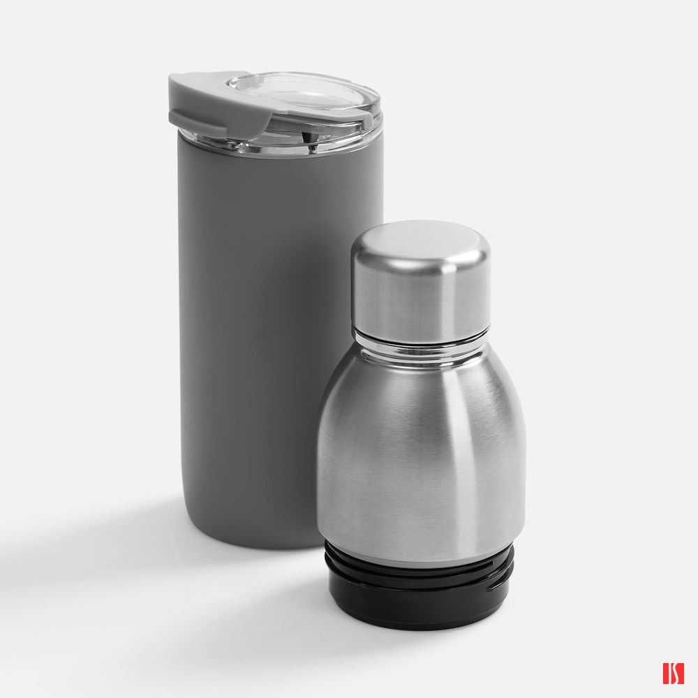 Заказать с нанесением логотипа от компании «Синтезис». Varianti — это яркий пример посуды с двойной функциональностью. Один и тот же корпус можно превратить как в термостакан для чая и кофе с пластиковой крышкой, так и в термобутылку для прохладительных напитков — с крышкой стальной.