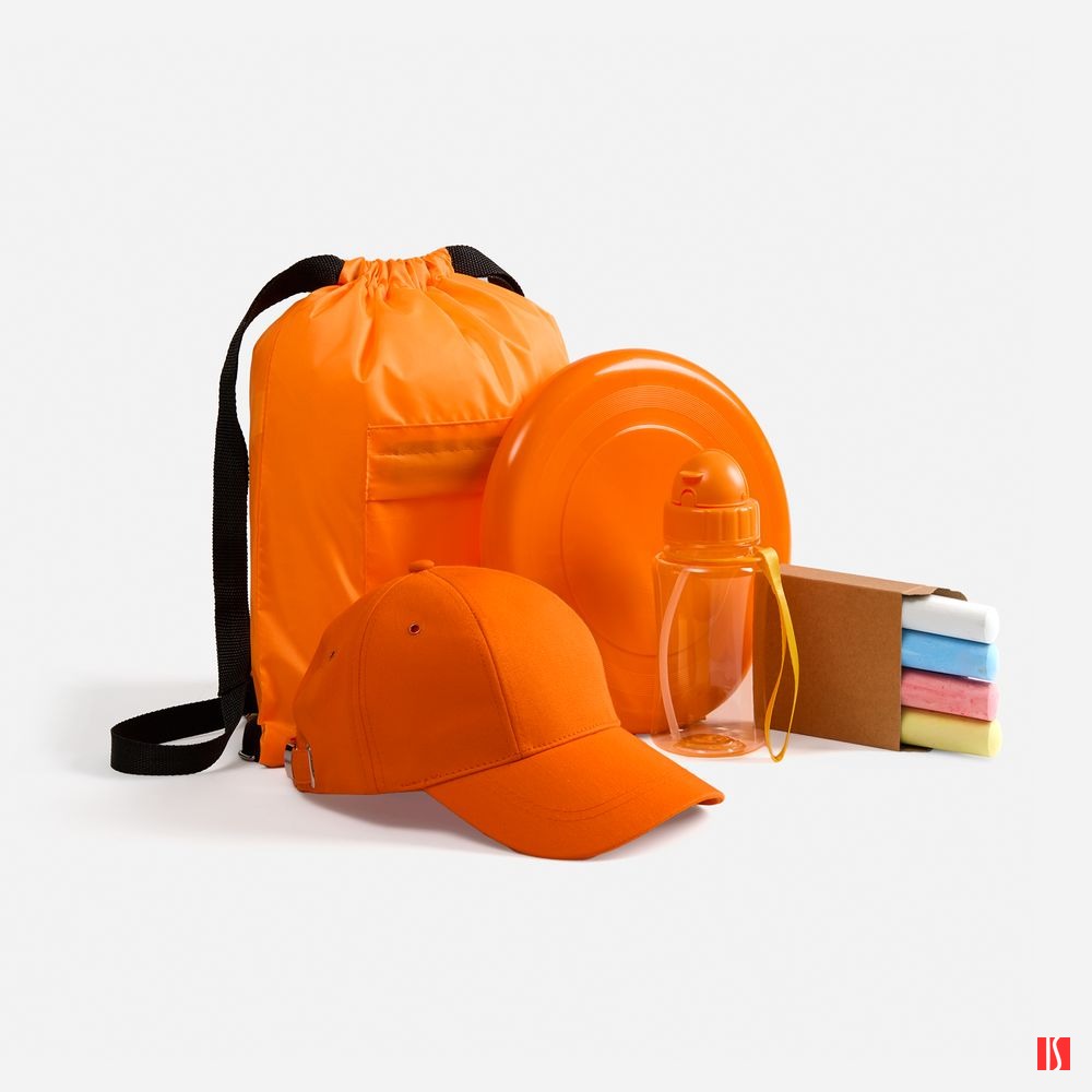 Детский набор для творчества: 4 цветных мелка, бутылка для воды, стильная бейсболка с защитой от солнца, тарелка-фрисби для самых активных и яркий детский рюкзак-мешок — все, что нужно для творческих приключений на свежем воздухе.