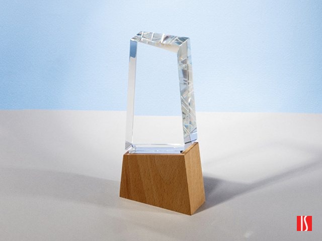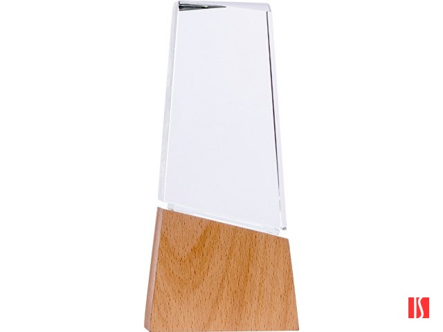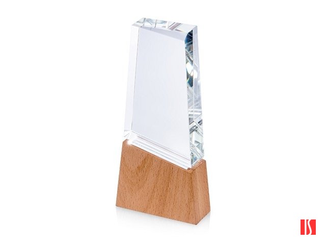 Заказать с нанесением логотипа от компании «Синтезис». Награда выполнена из прозрачного стекла, имеет необычную форму и расположена на деревянном постаменте. Лаконична и минималистична.