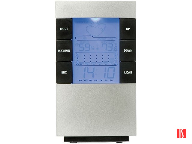 Настольная метеостанция с будильником с повторением сигнала, с указанием даты и дня недели, подсветкой, термометром в градусах по Цельсию и Фаренгейту, гигрометром и прогнозом погоды. Требуются 2 батарейки размера AAA (не включены в комплект). Пластик. Заказать с нанесением логотипа от компании «Синтезис».