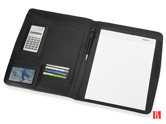 Стильная папка для документов Guidon – прекрасный подарок для делового человека. Папка формата А4 со сменным блокнотом и встроенным калькулятором. Сделана из искусственной кожи, особенно стильный вид ей придает цветная отделка внутри и снаружи. На лицевую сторону можно сделать нанесение шильда или тиснение. Заказать с нанесением логотипа от компании «Синтезис».