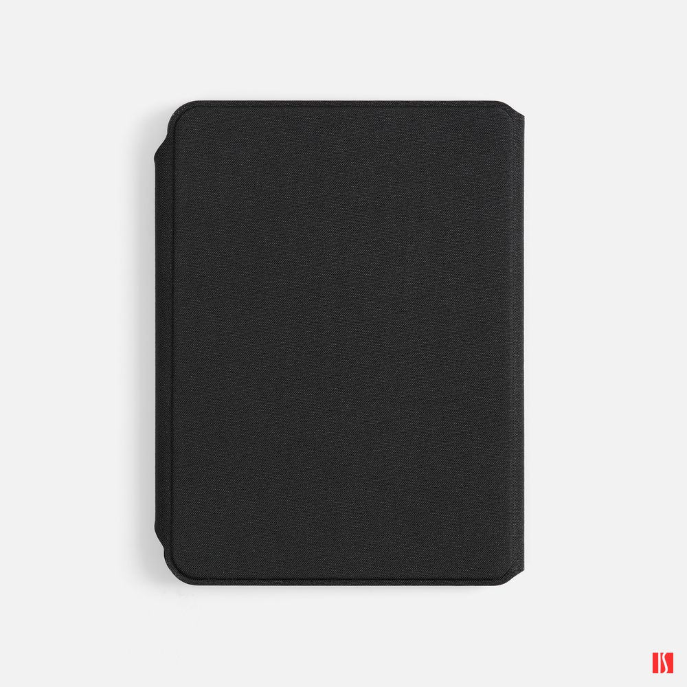 Обложка из ткани, на магнитной застежке с деревянной шильдой: