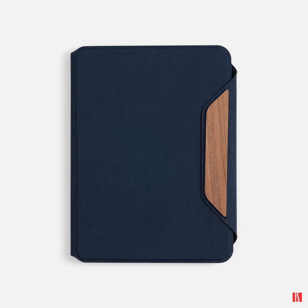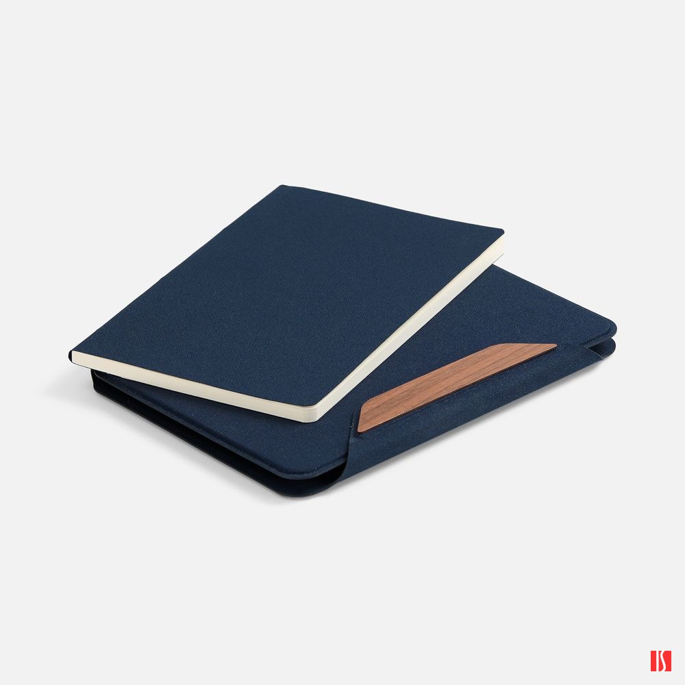 Обложка из ткани, на магнитной застежке с деревянной шильдой: