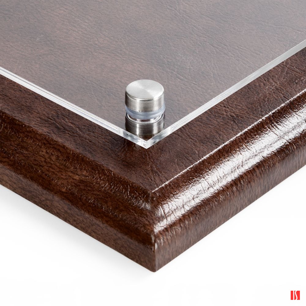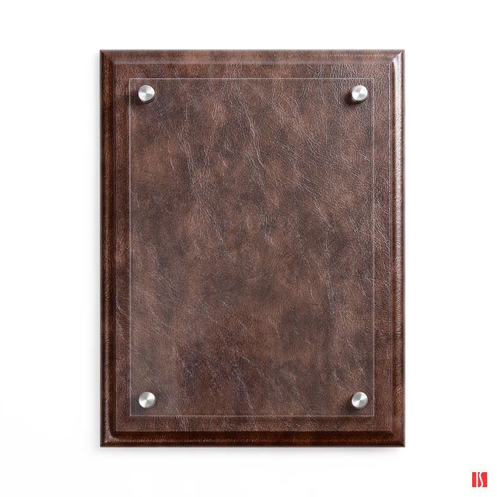 Классическая плакетка с имитирующей кожаную текстуру основой и акриловой вставкой — универсальный инструмент, чтобы рассказать о достижениях команды.