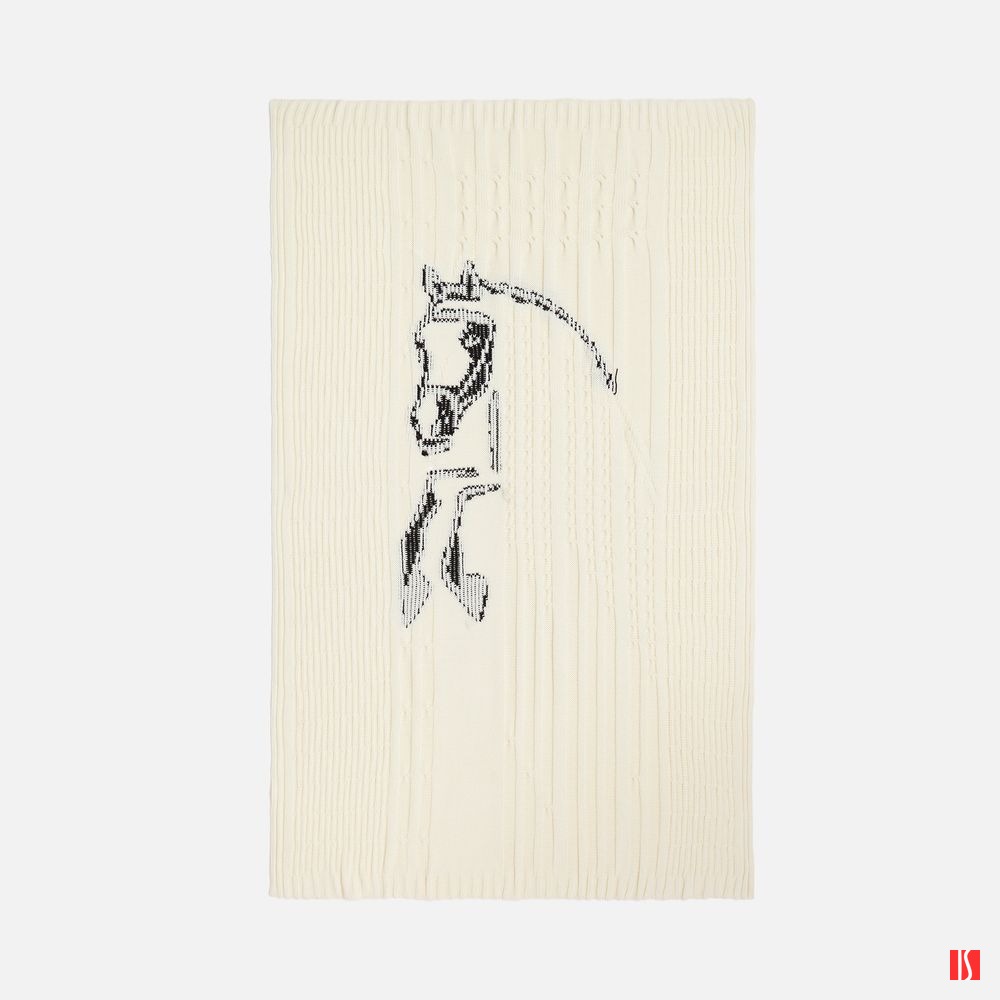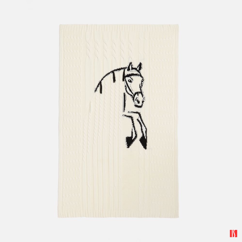 Лошадка на пледе будто встала на дыбы с согнутыми передними ногами, то есть в стойку курбет — бойкая и игривая. Дополнительного очарования и объема добавляют ей аккуратные кисточки на гриве. Словно незаконченный карандашный рисунок или эскиз, лошадь контрастно выделяется на общем белом фоне, символизируя полную готовность к грядущему году и его вызовам. А как еще встречать Новый год, если не с радостью и бурным желанием устремиться вперед?