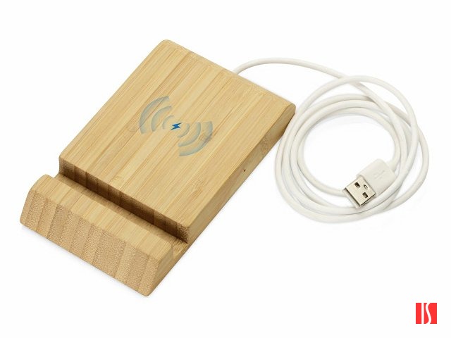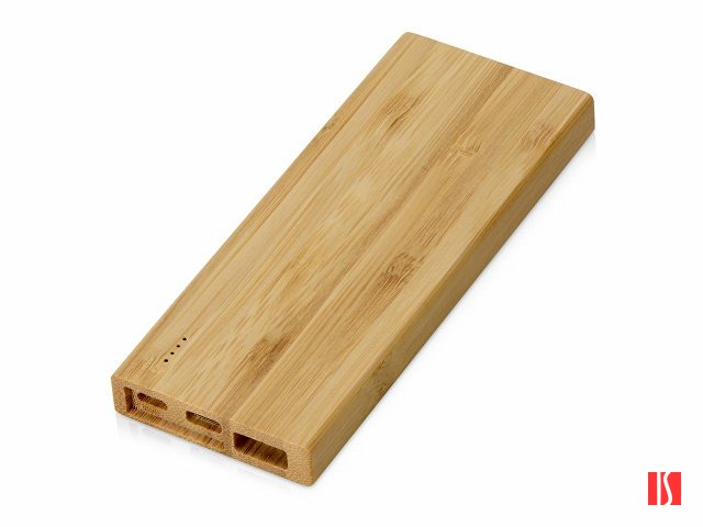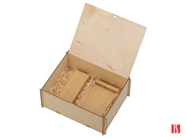 Заказать с нанесением логотипа от компании «Синтезис». Экологичный и технически продвинутый набор из бамбука: пауэрбанк и беспроводная зарядка.