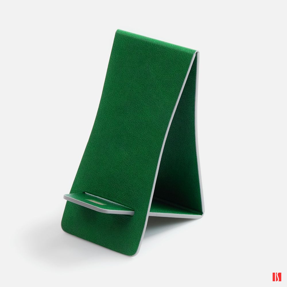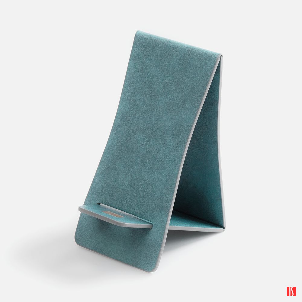 Складная подставка для телефона с вырубкой под шнур зарядного устройства. Выполнена из материала Petrus.