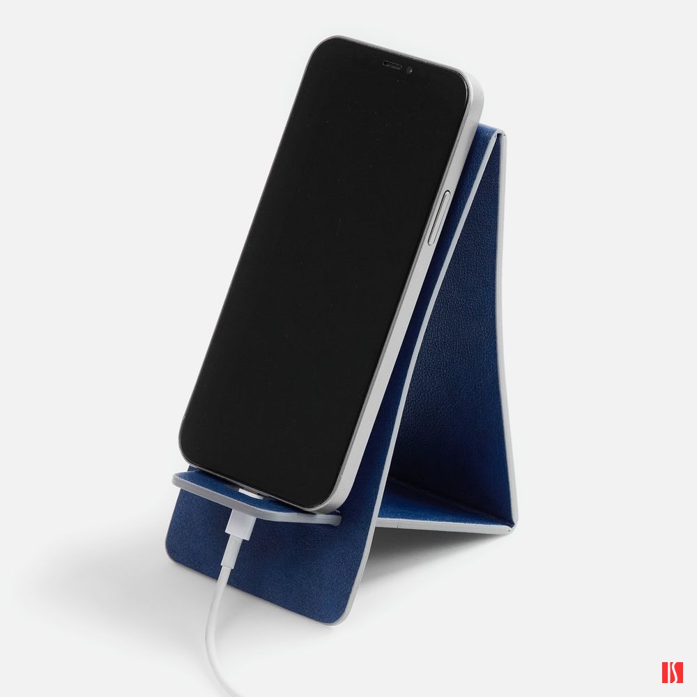Складная подставка для телефона с вырубкой под шнур зарядного устройства. Выполнена из материала Petrus.