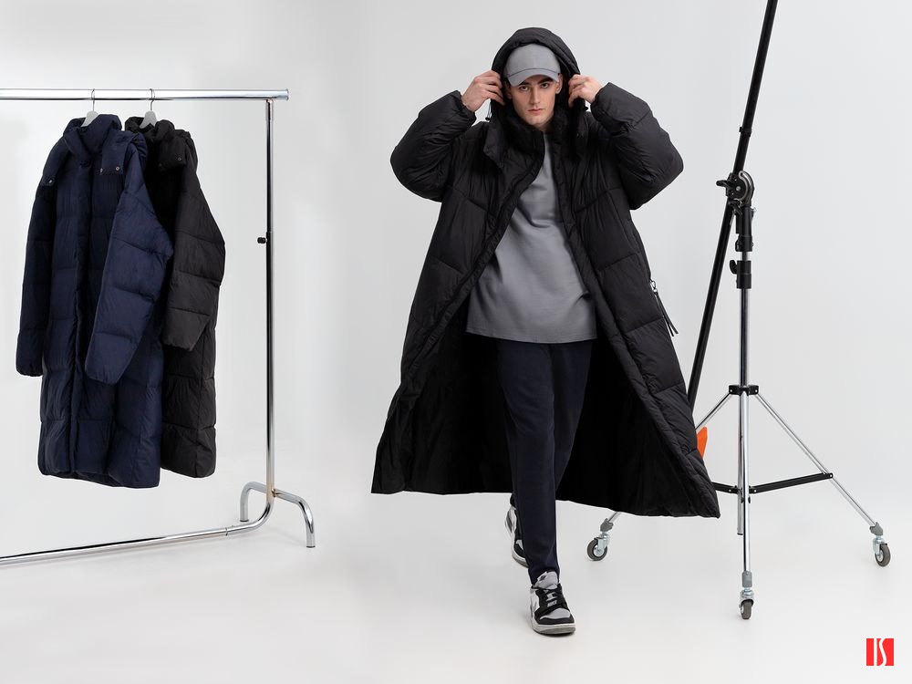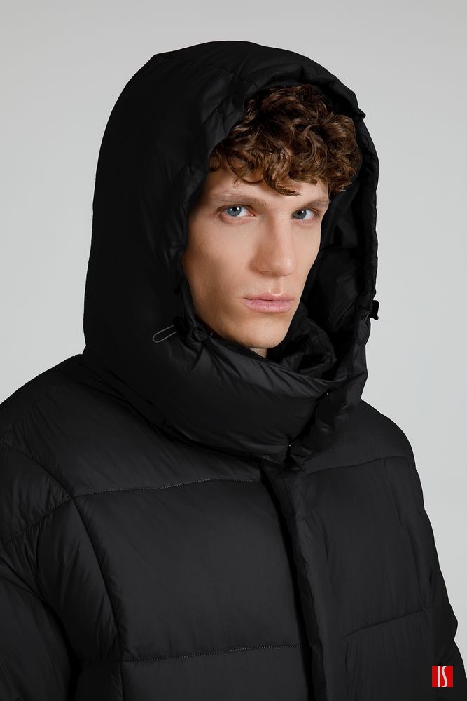 Удлиненный пуховик унисекс с капюшоном.