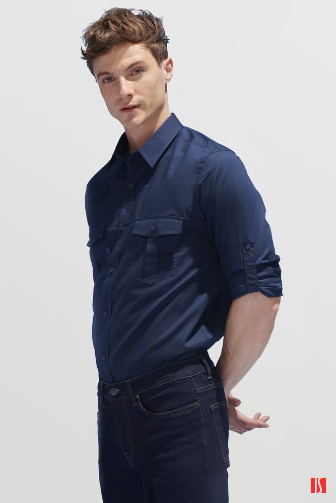 Заказать с нанесением логотипа от компании «Синтезис». Рубашка прямого кроя в стиле «сафари» с планкой на 7 пуговиц в тон и манжетами на 1 пуговице.