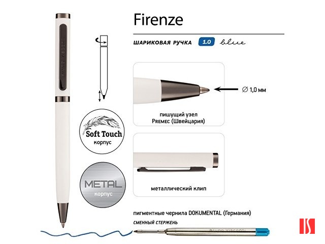 Ручка автоматическая, с легким поворотным механизмом подачи стержня. Надежный пишущий узел d 1,0 мм (от швейцарского производителя Premec) гарантирует высокое качество также, как и пигментные чернила Dokumental (Германия). Благодаря им писать ручкой «Firenze» одно удовольствие – она мягко скользит по поверхности бумаги, оставляя ровную, четкую линию. Заказать с нанесением логотипа от компании «Синтезис».