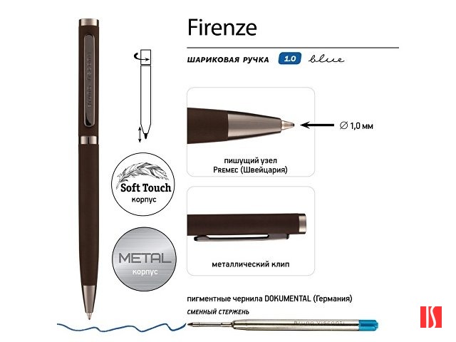 Ручка автоматическая, с легким поворотным механизмом подачи стержня. Надежный пишущий узел d 1,0 мм (от швейцарского производителя Premec) гарантирует высокое качество также, как и пигментные чернила Dokumental (Германия). Благодаря им писать ручкой «Firenze» одно удовольствие – она мягко скользит по поверхности бумаги, оставляя ровную, четкую линию. Заказать с нанесением логотипа от компании «Синтезис».