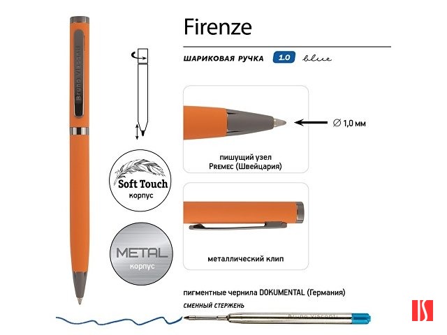 Ручка автоматическая, с легким поворотным механизмом подачи стержня. Надежный пишущий узел d 1,0 мм (от швейцарского производителя Premec) гарантирует высокое качество также, как и пигментные чернила Dokumental (Германия). Благодаря им писать ручкой «Firenze» одно удовольствие – она мягко скользит по поверхности бумаги, оставляя ровную, четкую линию. Заказать с нанесением логотипа от компании «Синтезис».