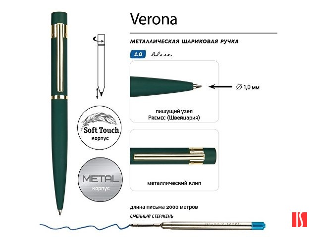 Ручка металлическая шариковая "Verona", софт-тач, 1.0 мм, зеленый