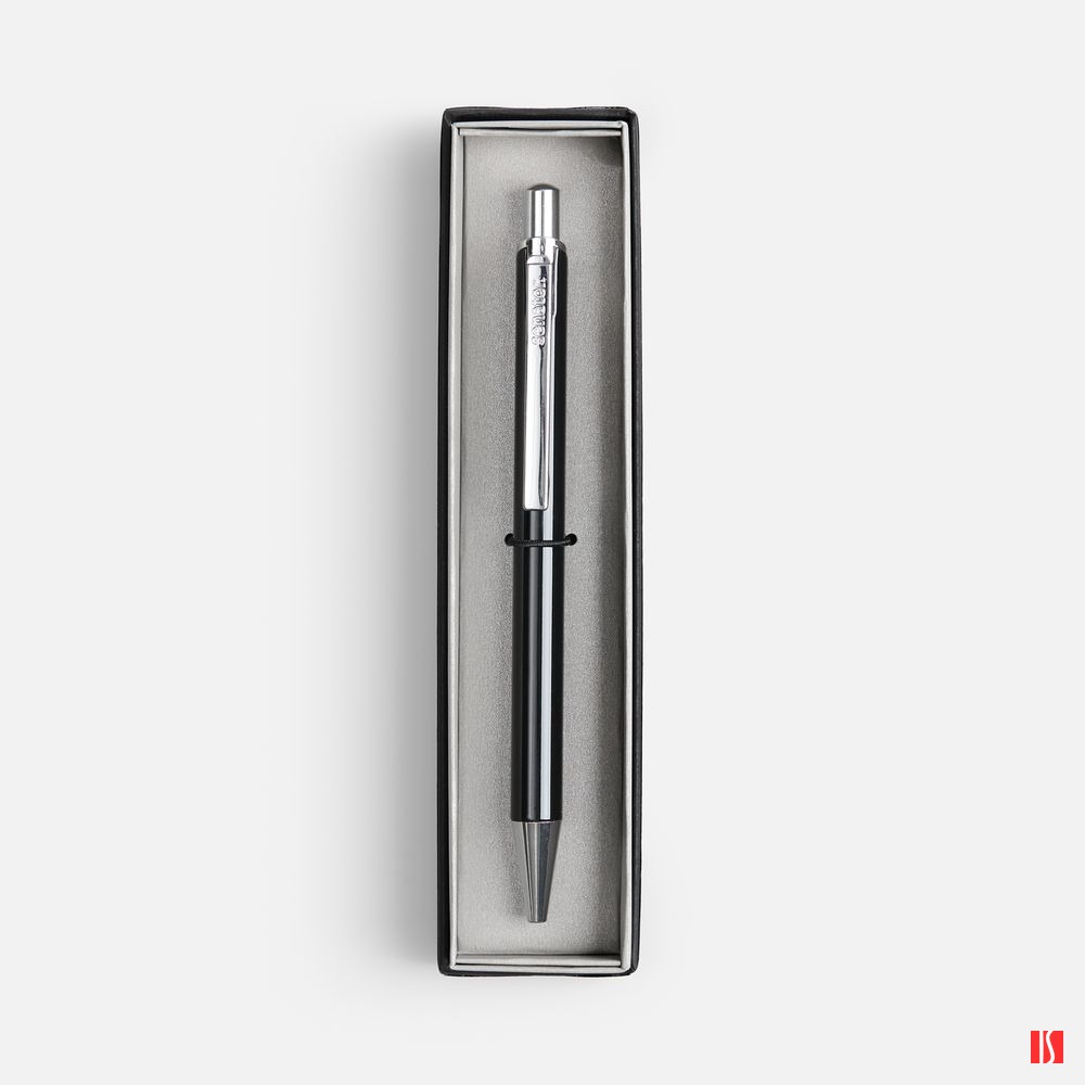 Шариковая ручка Arvent в лакированном корпусе с хромированными деталями. Футляр из дизайнерской бумаги с контрастным коробом придает подарку законченный и элегантный вид.