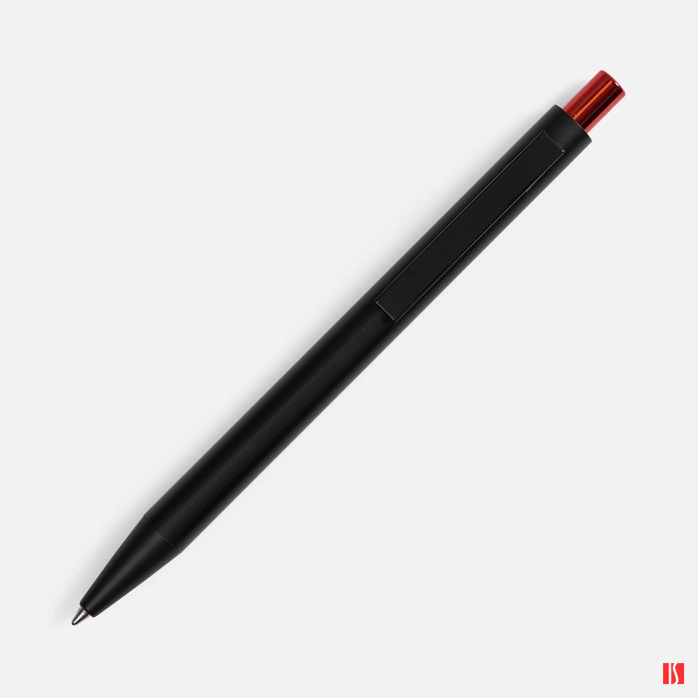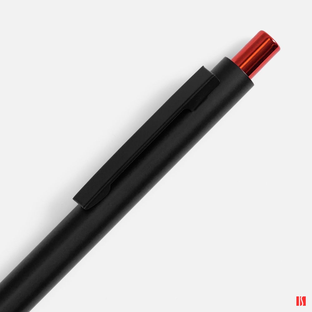 Ручка строгих форм в черном матовом корпусе с цветными деталями, которая точно может удивить, — гравировка на ней вскрывается цветом в тон кнопке.