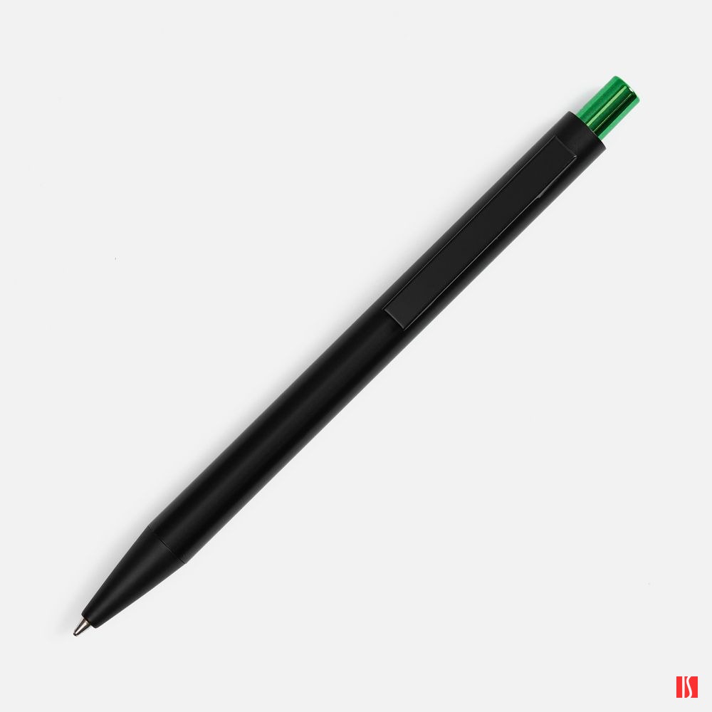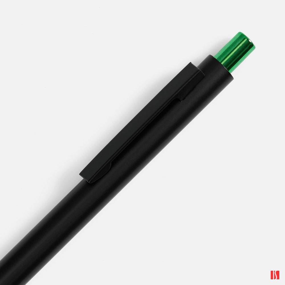 Ручка строгих форм в черном матовом корпусе с цветными деталями, которая точно может удивить, — гравировка на ней вскрывается цветом в тон кнопке.