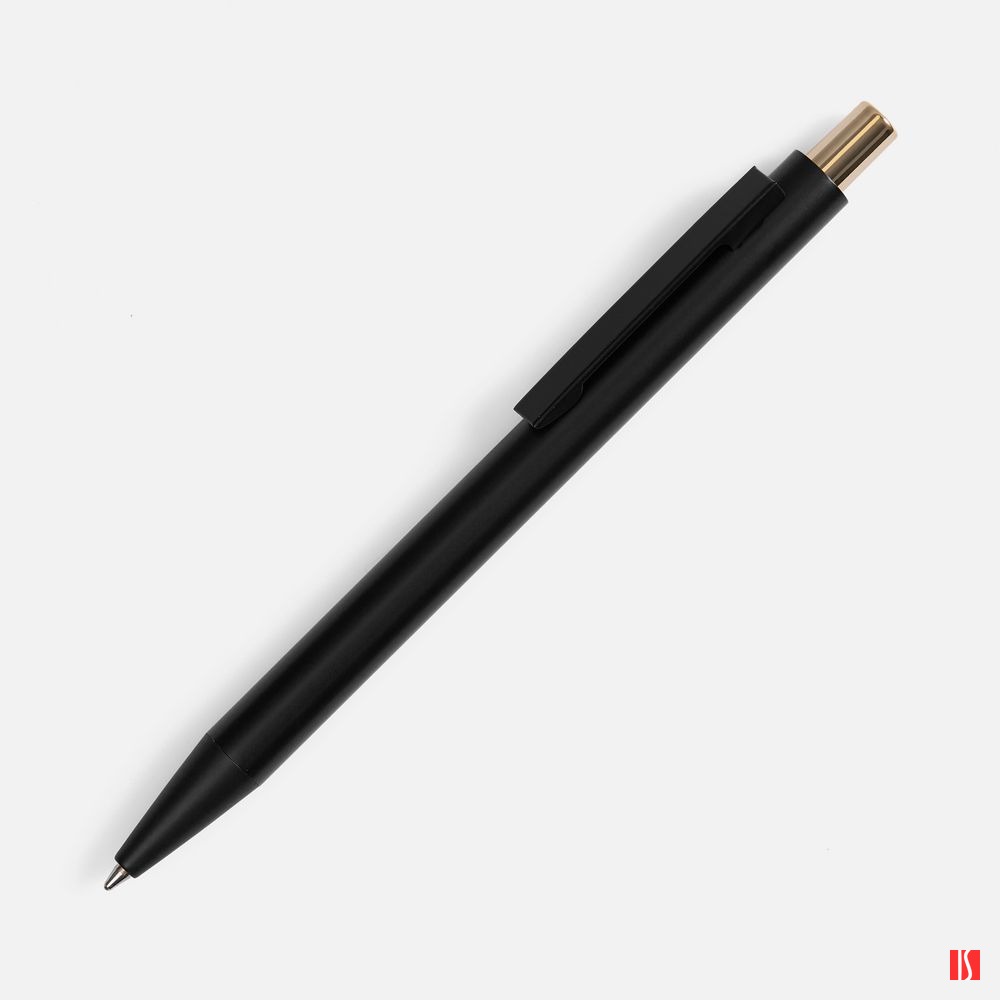 Ручка строгих форм в черном матовом корпусе с цветными деталями, которая точно может удивить, — гравировка на ней вскрывается цветом в тон кнопке.
