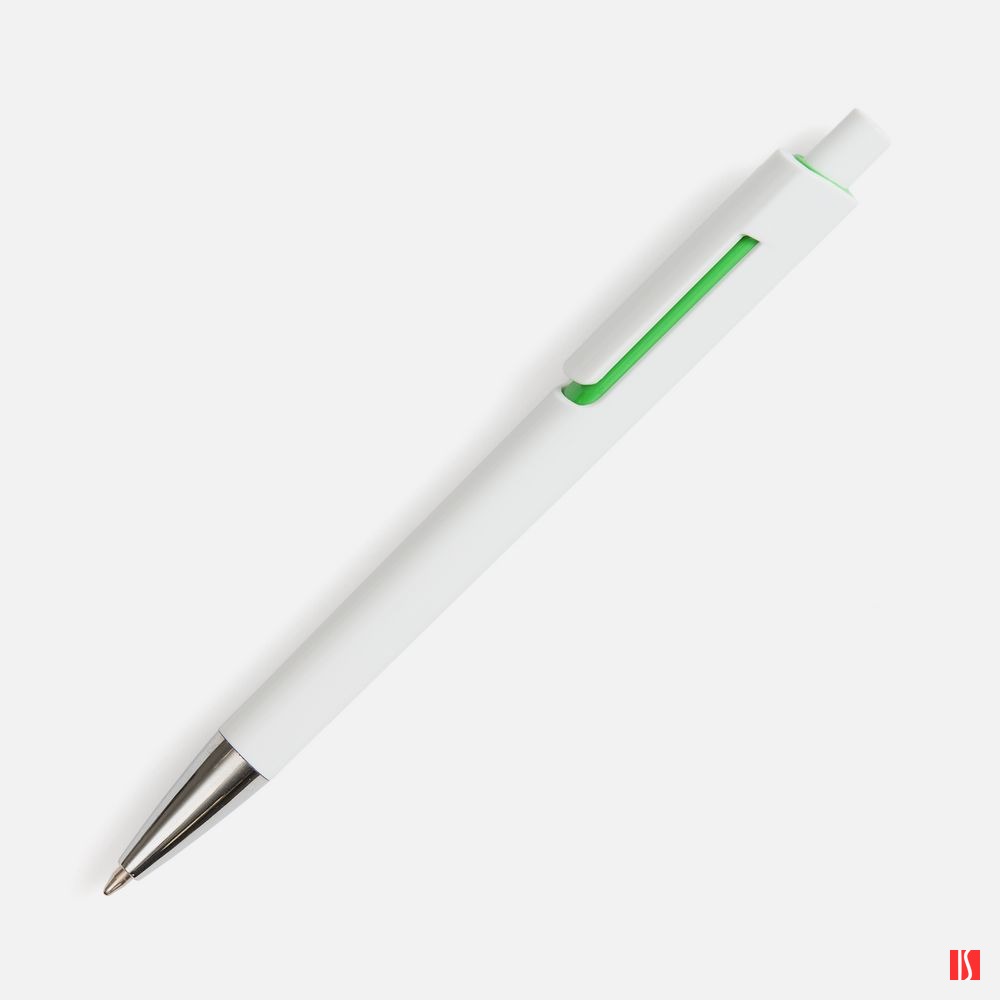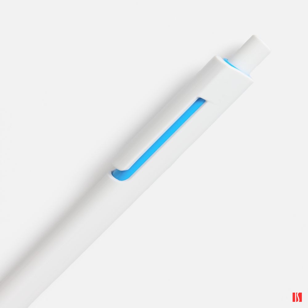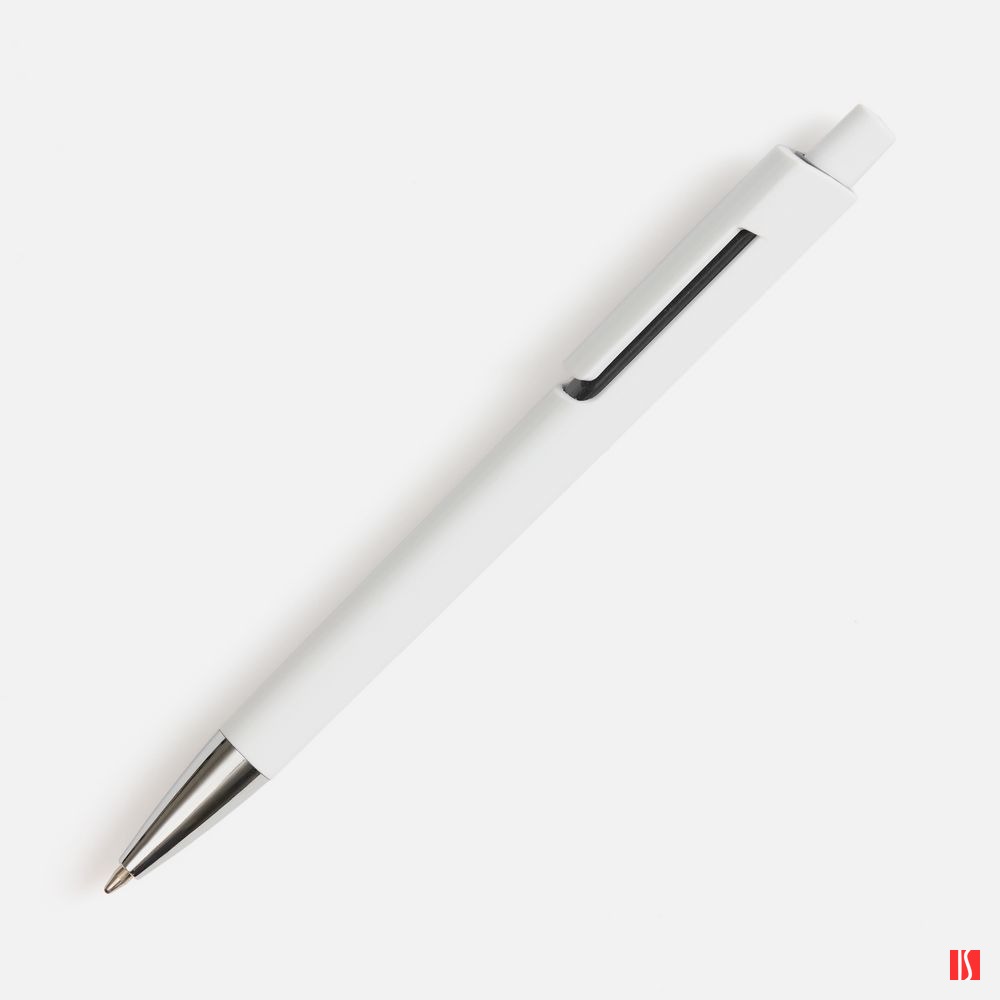 Заказать с нанесением логотипа от компании «Синтезис». Шариковая ручка с глянцевым белым корпусом и цветовым акцентом у клипа, который дополнит логотип компании.