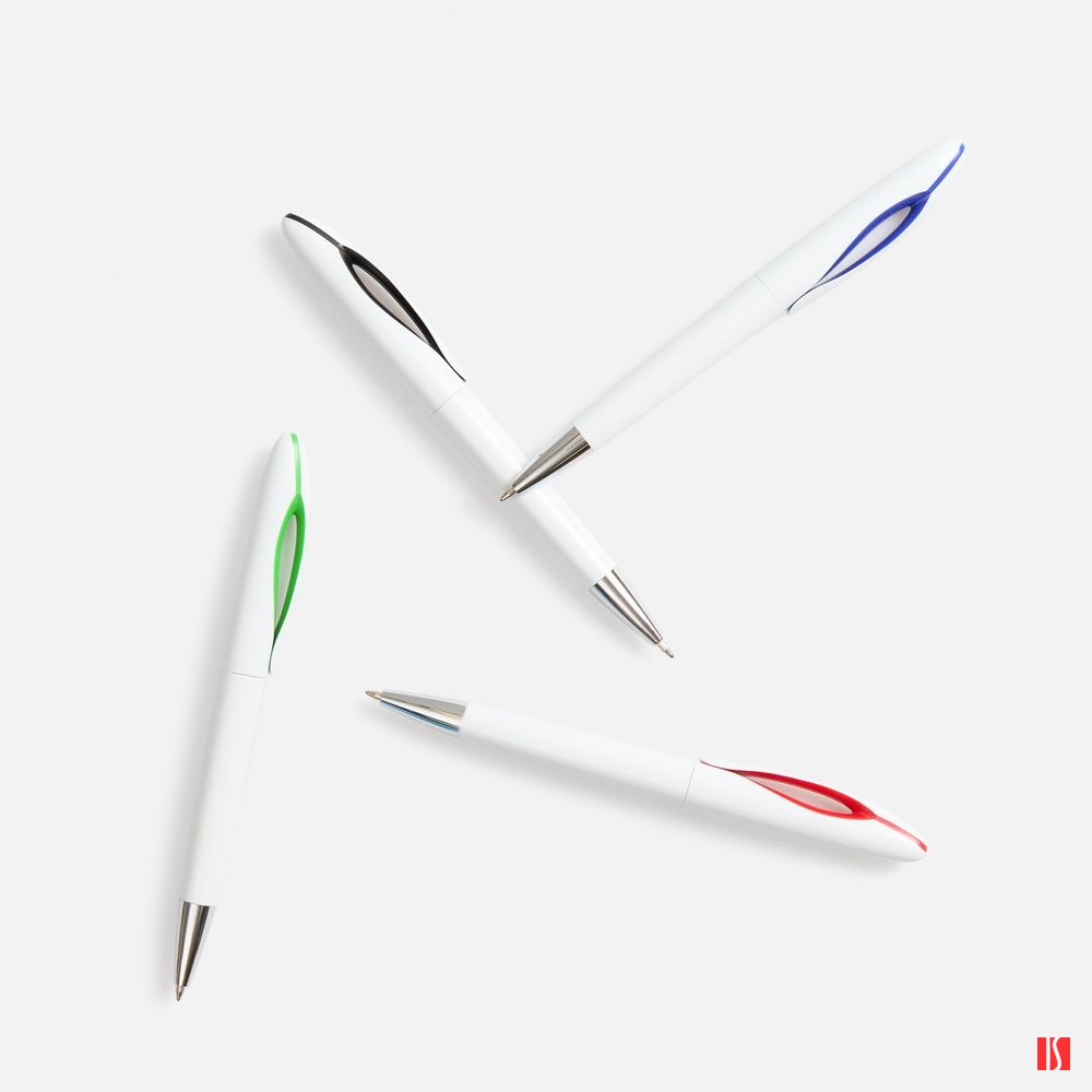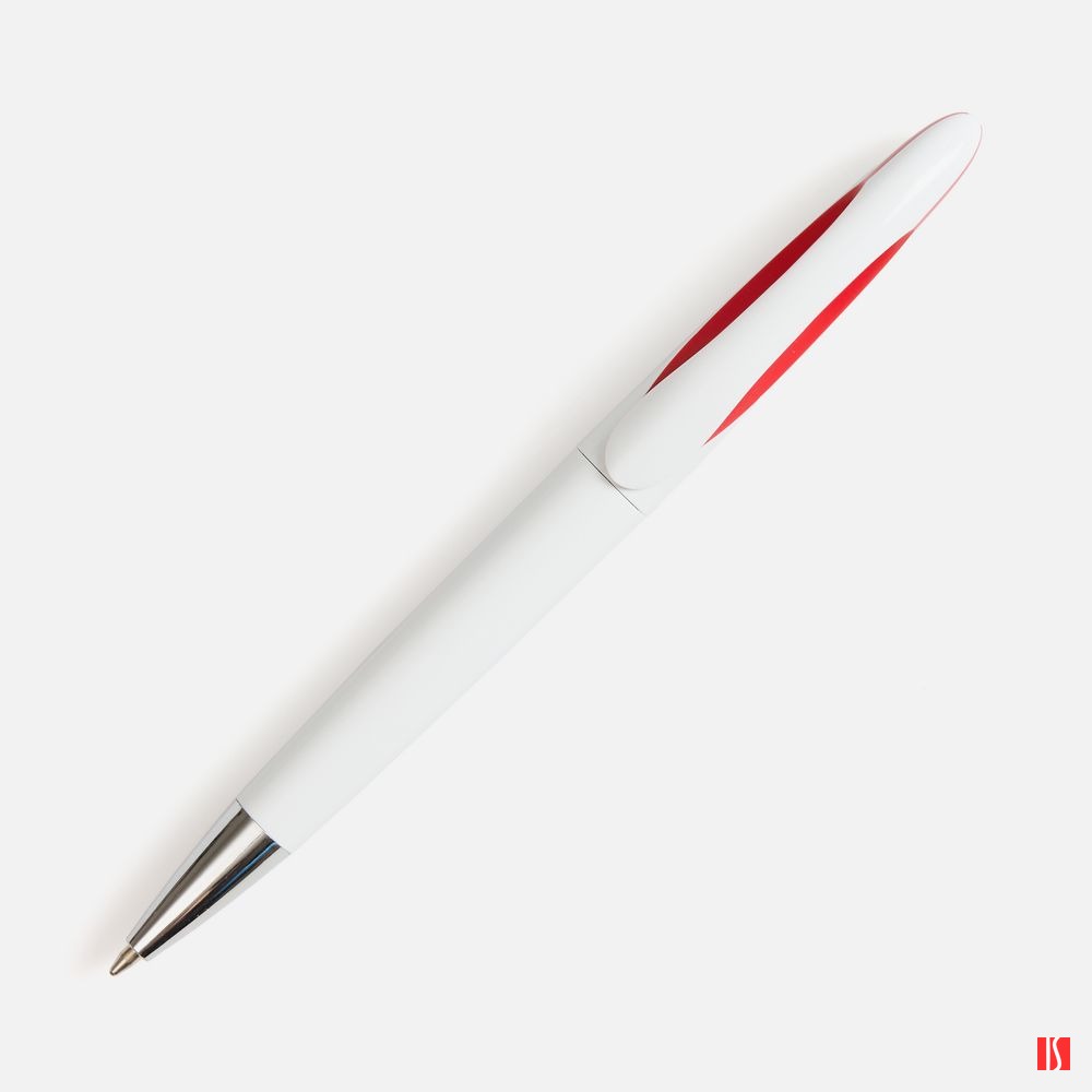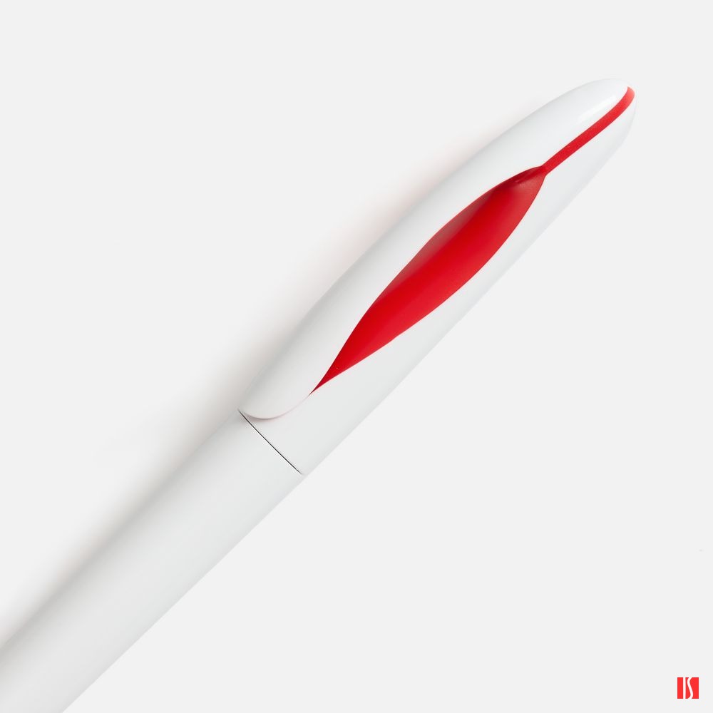 Шариковая ручка приятных округлых форм с белым глянцевым корпусом и цветовым акцентом.