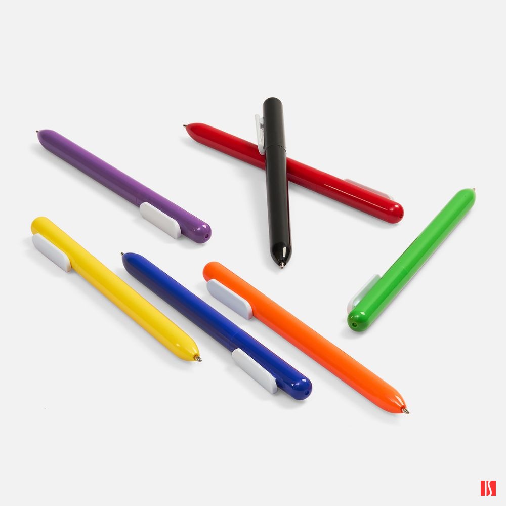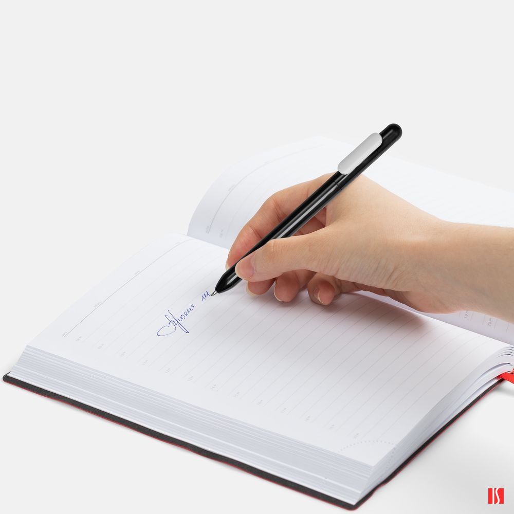 Заказать с нанесением логотипа от компании «Синтезис». Ручка из глянцевого пластика с белым клипом.