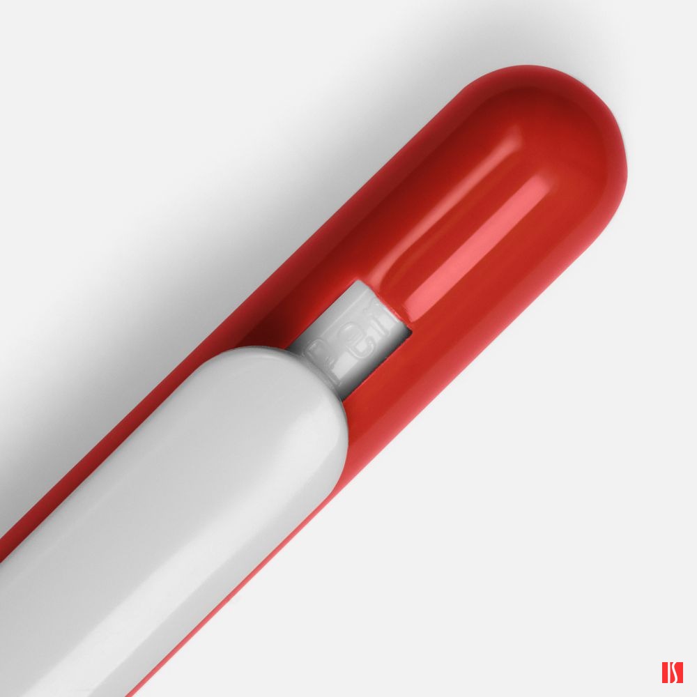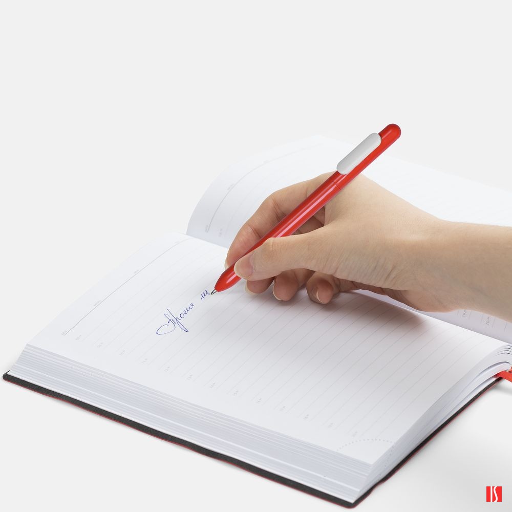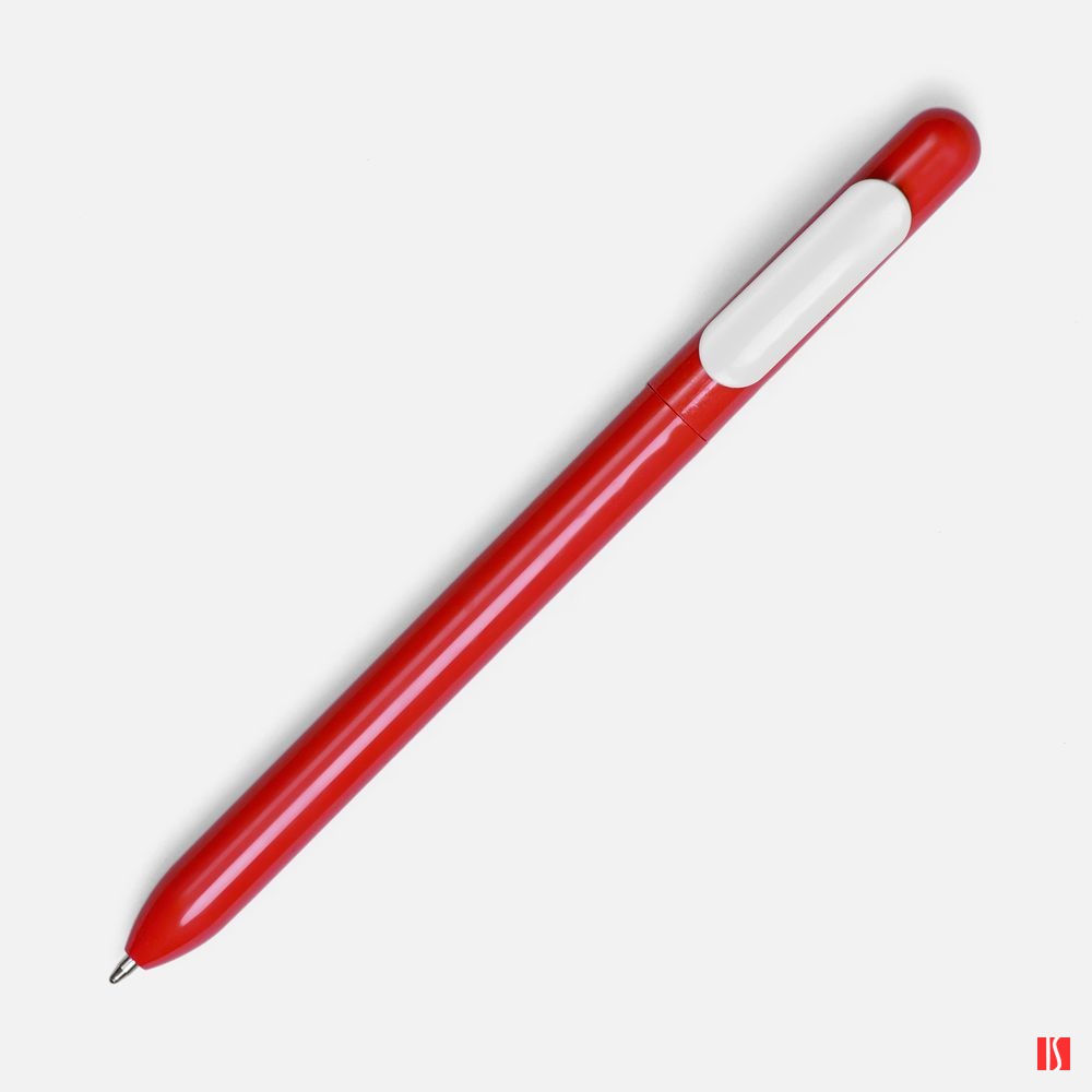 Заказать с нанесением логотипа от компании «Синтезис». Ручка из глянцевого пластика с белым клипом.