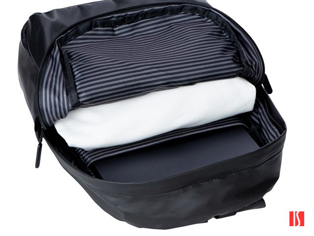 Элегантный легкий городской рюкзак из мягкого приятного на ощупь материала можно использовать для передвижений по городу, а так же в поездках, для чего на спинке предусмотрен ремень для крепления на ручку чемодана. Для удобства и компактного хранения содержимого снаружи расположены 2 передних кармана на молниях и 2 боковых кармана. Внутри уплотненный карман для ноутбука. Стильная подкладка в полоску в тон цвета внешнего материала делает рюкзак модным аксессуаром. Благодаря водостойкому материалу и молниям содержимое рюкзака не намокнет под дождем. Лямки регулируются по длине. Заказать с нанесением логотипа от компании «Синтезис».