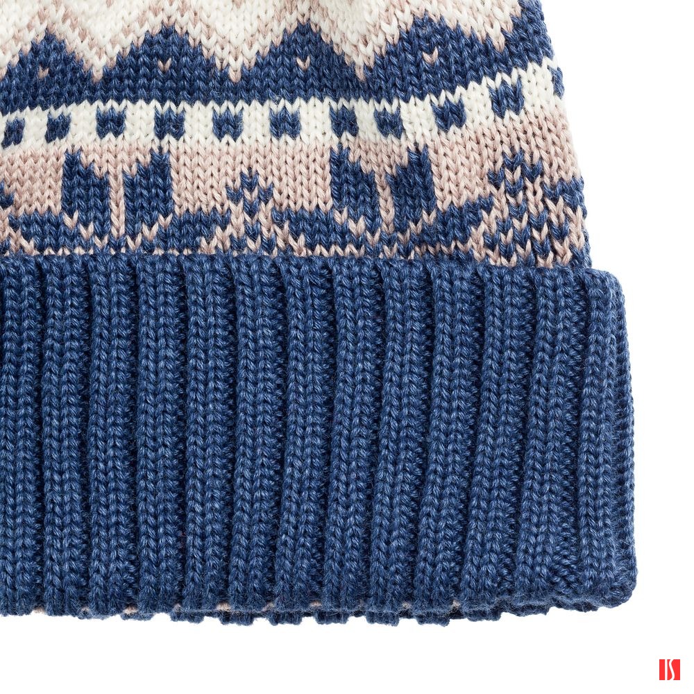 Модель: шапка с жаккардовым узором в 2-3 цвета и отворотом в 1 цвет, помпон 8 см, крупная петля. Шапка некроеная, с макушкой на стяге, которая всегда будет однотонной. Узор максимально простой и графичный, без сложных мелких деталей.