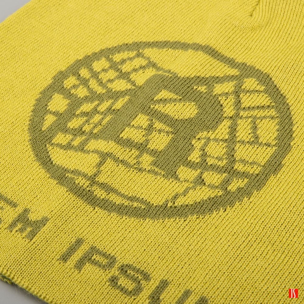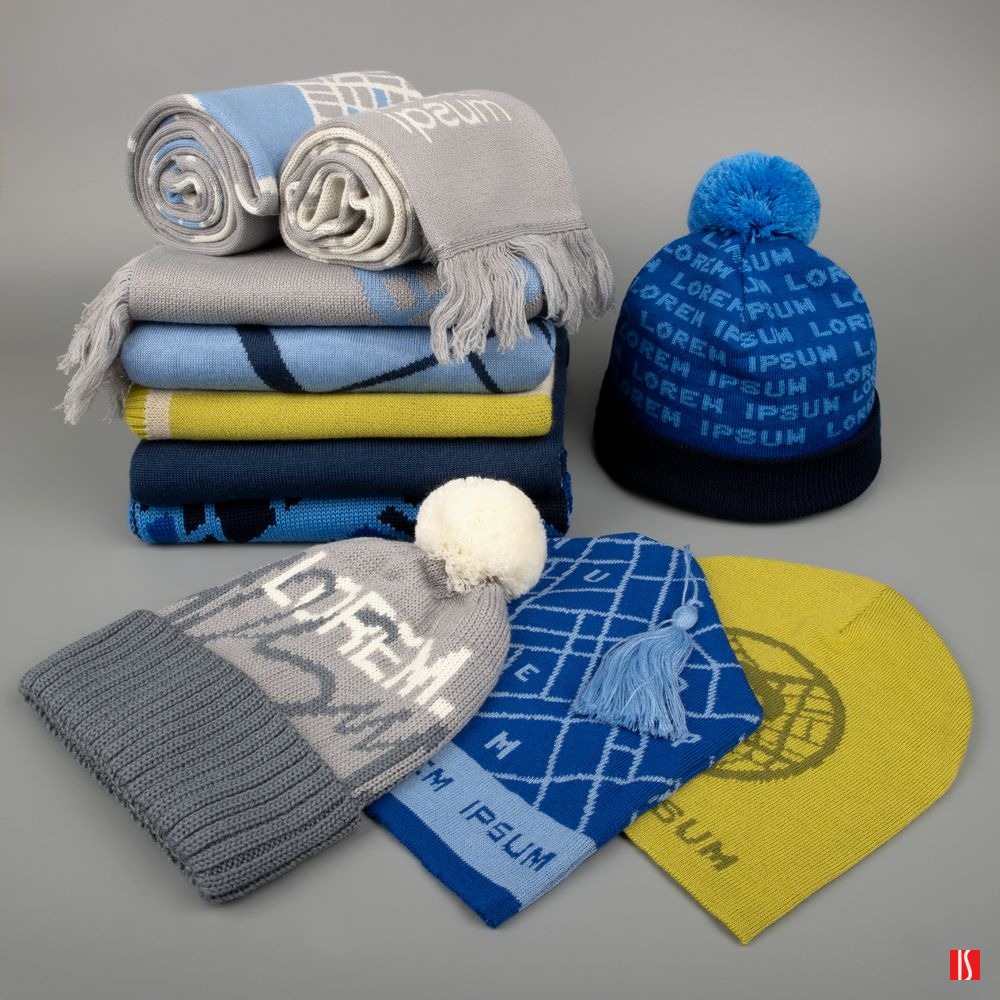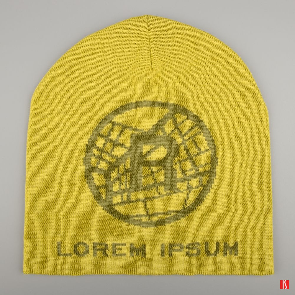 Заказать с нанесением логотипа от компании «Синтезис». Шапка с вывязанным логотипом и индивидуальным рисунком в фирменной цветовой гамме.