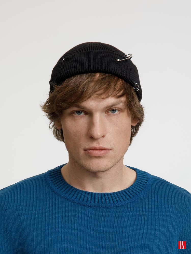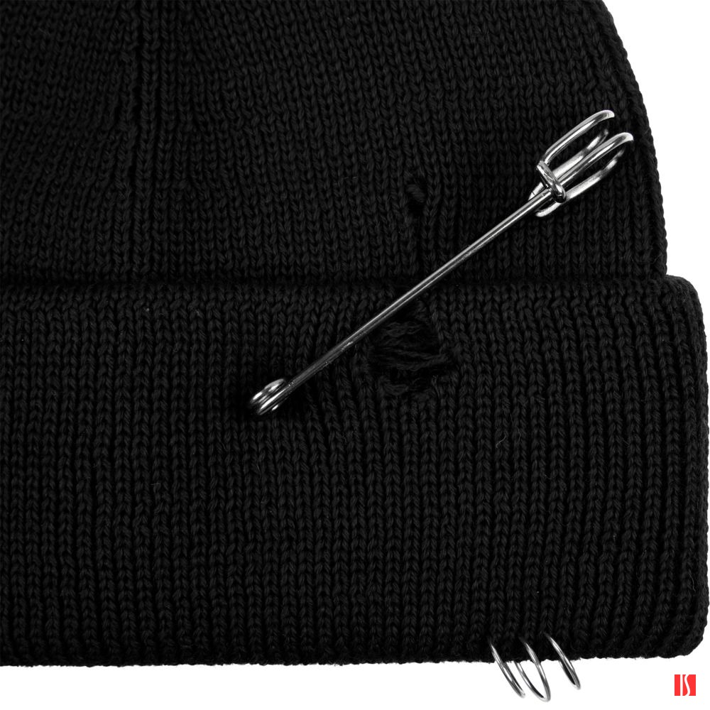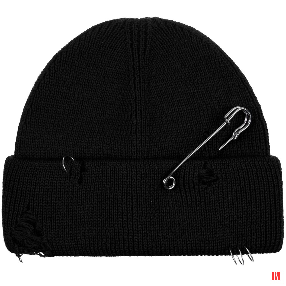Однослойная шапка бини с рваным отворотом и металлическими аксессуарами для дерзких образов в любом возрасте. Яркий и запоминающийся акцент в стиле гранж.