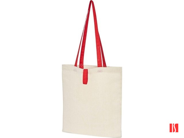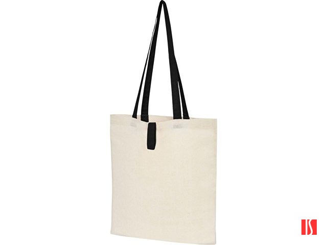 Эко-сумка с открытым основным отделением и цветными ручками, раскладывающаяся в высоту на 32 см. Имеет ремень с пуговичной застежкой, чтобы закрывать сумку. Прочность до 8 кг. Заказать с нанесением логотипа от компании «Синтезис».