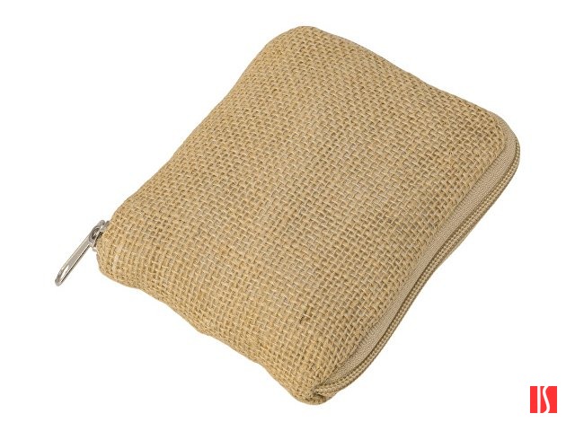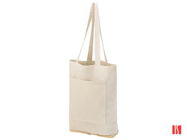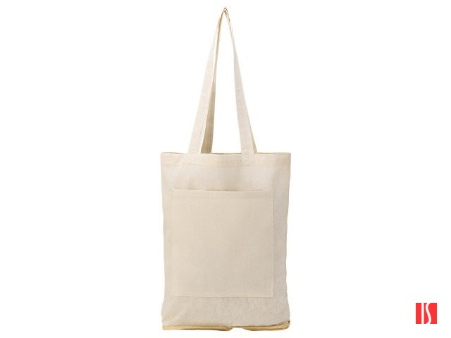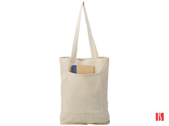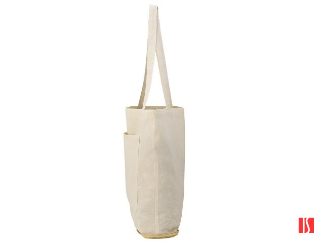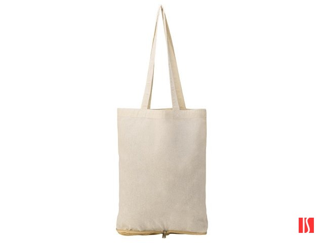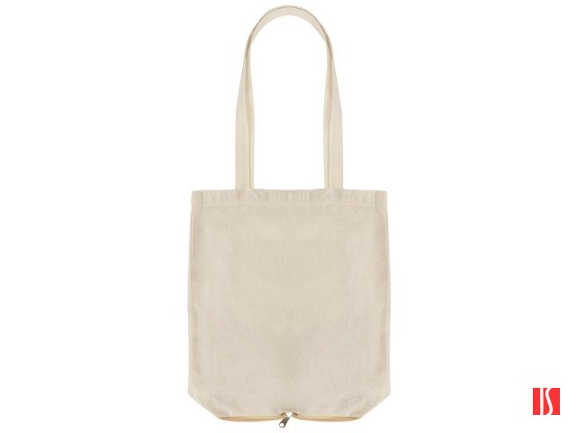 Складная сумка из хлопка с дном из джута. Снаружи большой вместительный карман. В сложенном виде закрывается на молнию. Заказать с нанесением логотипа от компании «Синтезис».