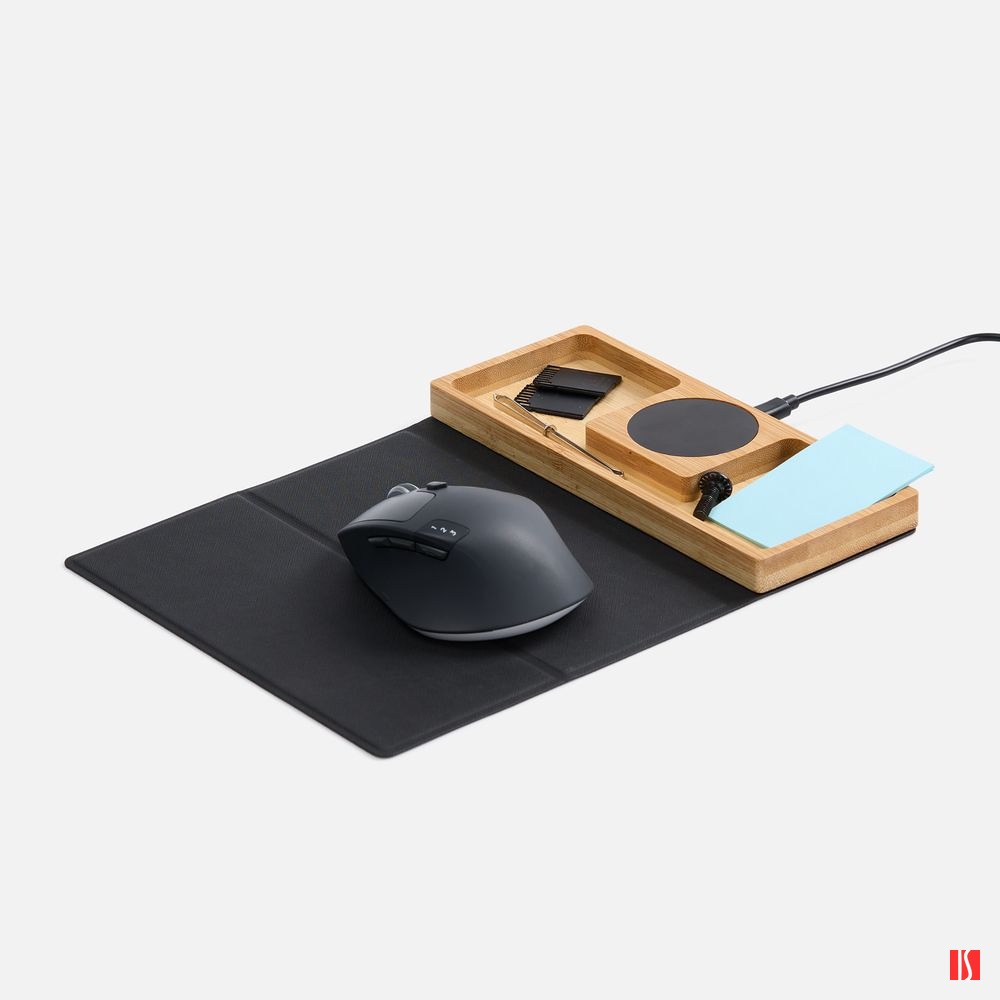 Midstream — это коврик для мышки с площадкой для беспроводной зарядки и отсеком для канцелярских принадлежностей. Его можно использовать как на работе, так и в дороге или на встречах: коврик компактно складывается и не занимает много места в сумке для ноутбука.