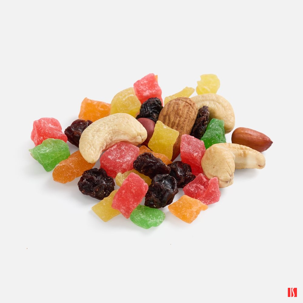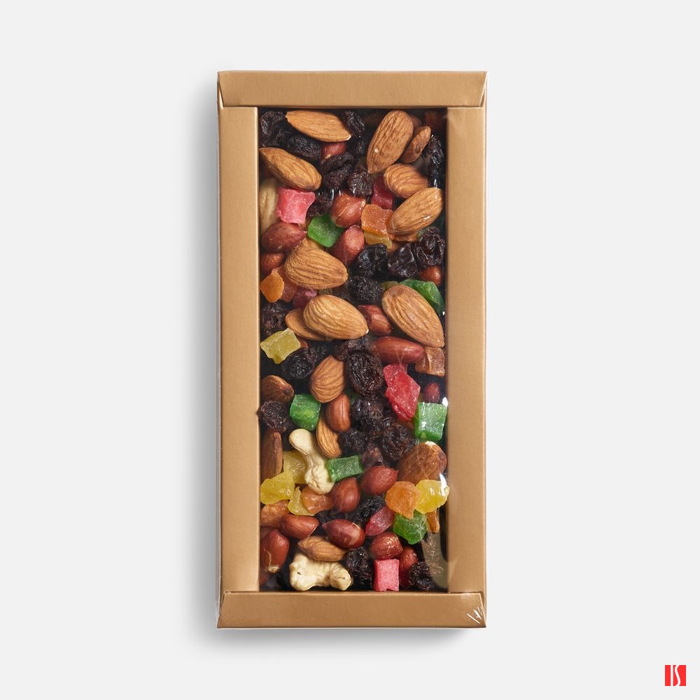 Состав: миндаль, кешью, изюм темный, арахис очищенный, цукаты из ананаса.
