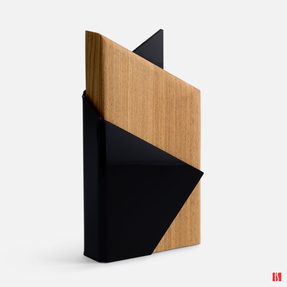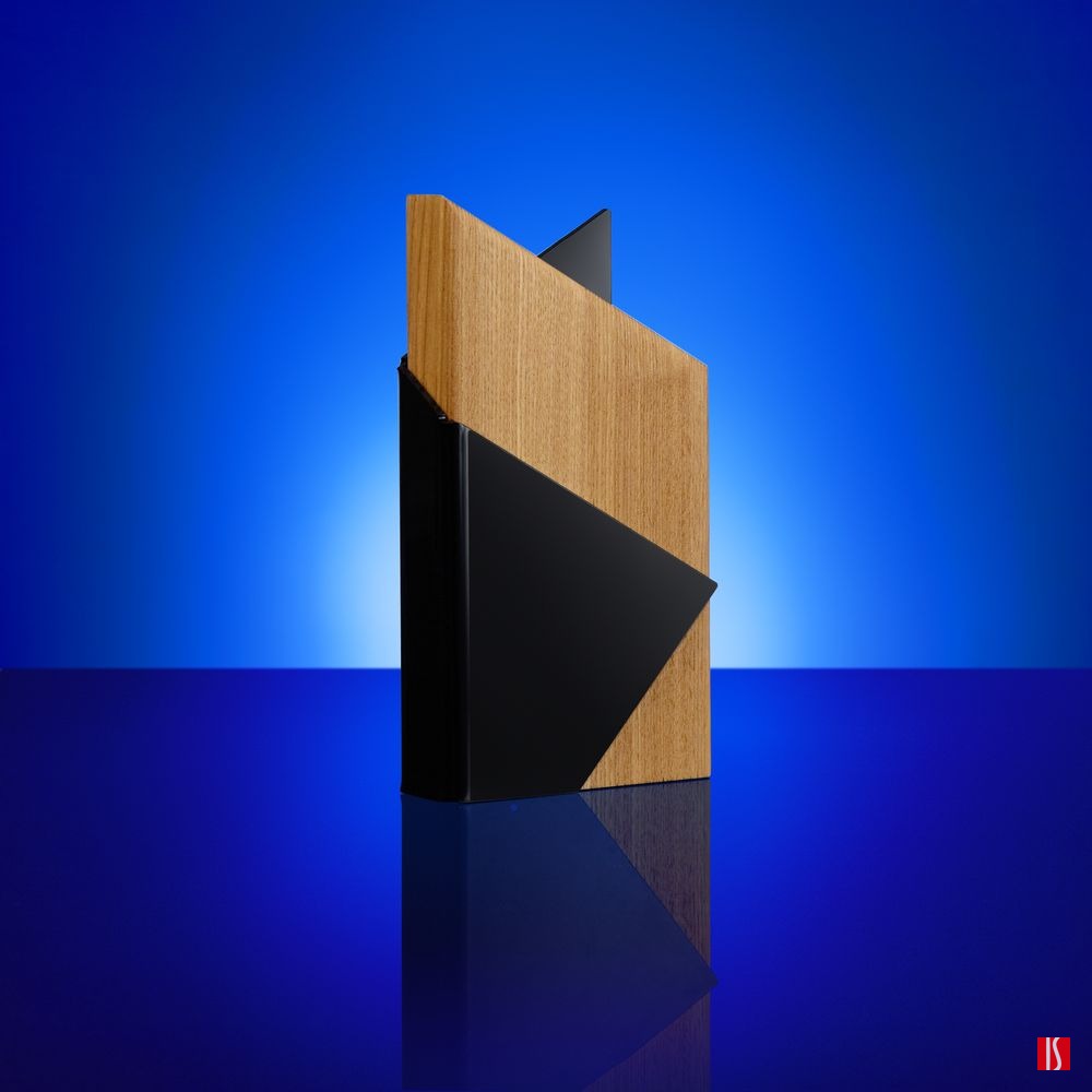Заказать с нанесением логотипа от компании «Синтезис». Majestas — уникальная стела с необычным дизайном. Выполненная из цельного бруса ясеня и гнутого цветного акрила эта стела станет украшением любого интерьера.